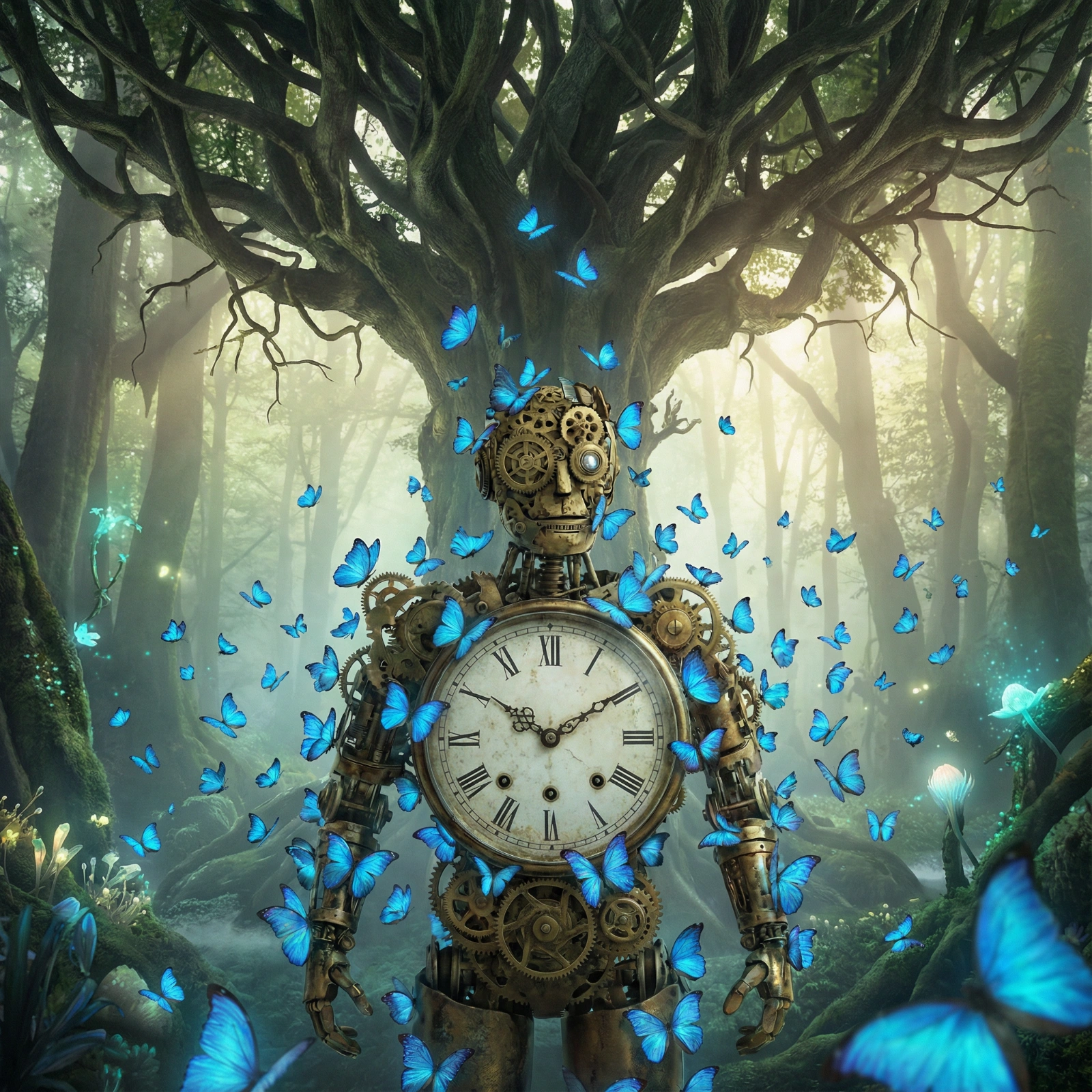 A humanoid figure made entirely of an antique wall clock face, covered in thousands of glowing, flapping blue butterflies, standing beneath a gigantic, inverted, root-up tree, ethereal forest, magical realism.