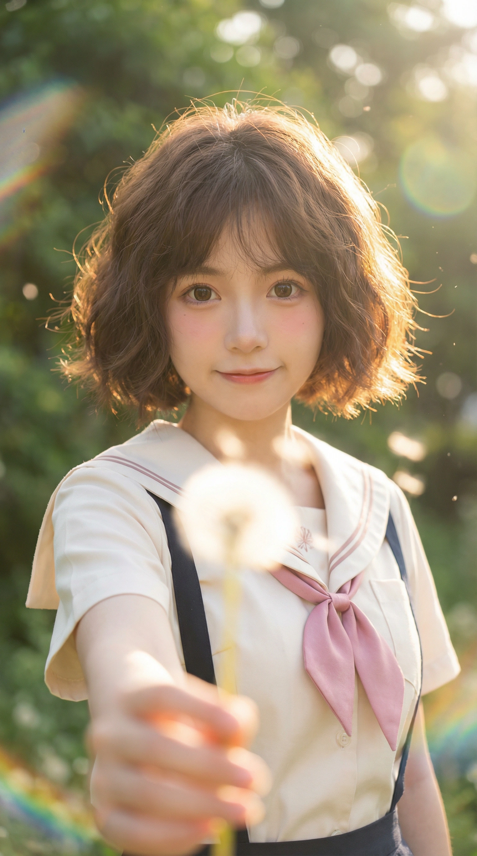{ "subject": "Young female with a delicate, ethereal appearance, reaching slightly towards the camera, holding a dandelion stem in the immediate foreground.", "clothing": "Japanese sailor-style school uniform (seifuku), cream or white blouse with a wide collar, pink or salmon-colored neckerchief/ribbon tied at the front, dark suspender straps.", "hair": "Short, bob-cut brown hair with loose, messy curls and waves. Tousled texture with stray hairs illuminated by backlighting (halo effect).", "face": "Soft, youthful features with a smooth complexion. Rosy blush on cheeks, large expressive brown eyes looking directly at the viewer, soft lips, gentle and calm expression.", "accessories": "A white dandelion seed head held in the foreground (heavily blurred).", "environment": "Outdoor garden or nature setting during the day. Blurred lush greenery in the background, floating dandelion seeds and dust particles in the air.", "lighting": "Strong backlighting creating a rim light effect on hair. Warm natural sunlight, atmospheric glow, prominent lens flares, rainbow prismatic refraction/light leaks in the corners, dappled light.", "camera": "Close-up portrait shot, extremely shallow depth of field (macro feel). Sharp focus on the subject's eyes and face, with heavily blurred foreground (dandelion) and background (bokeh).", "style": "Dreamy, cinematic, semi-realistic with anime aesthetics (2.5D), soft focus, ethereal mood, high-detail digital art style, nostalgic summer atmosphere." }