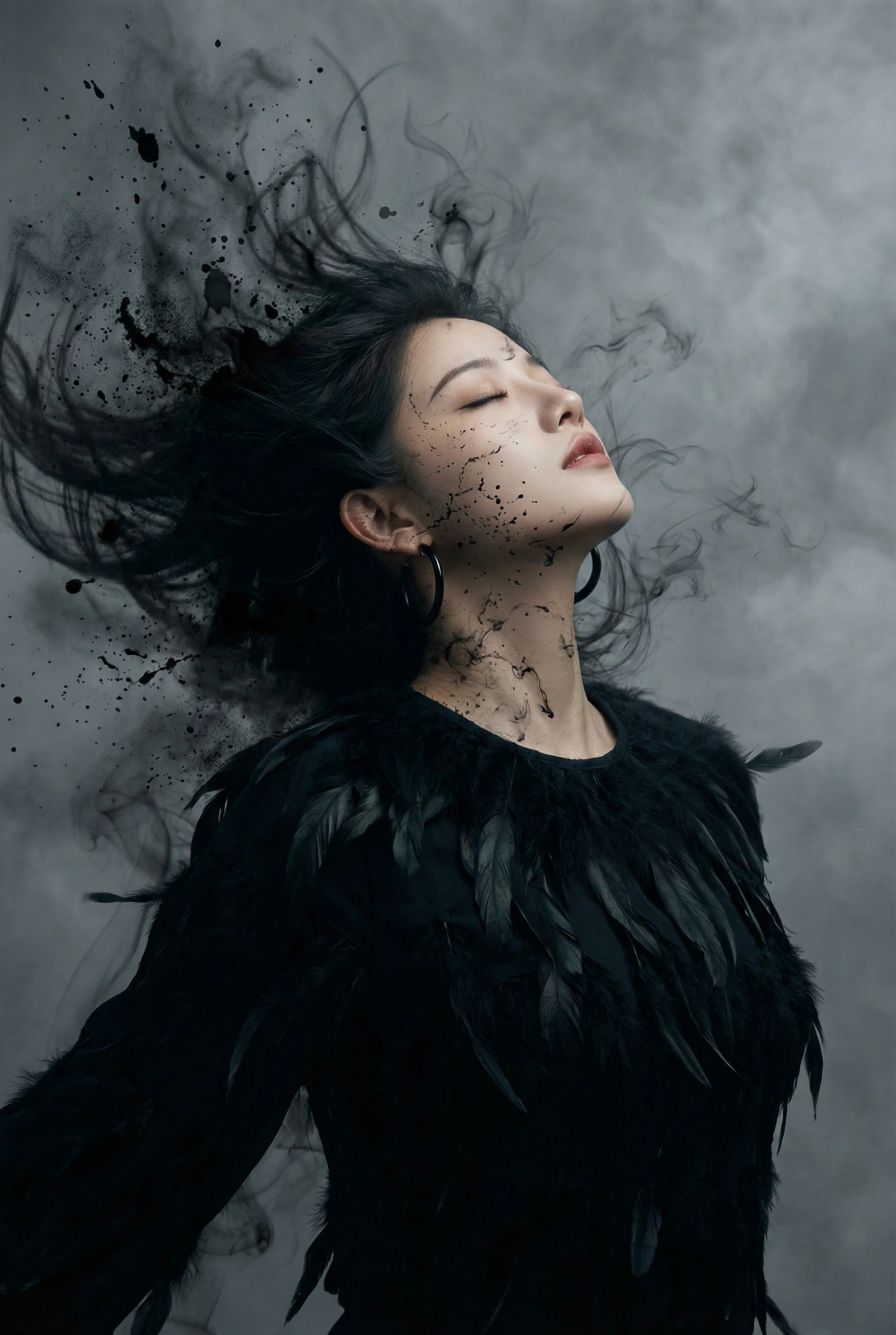 { "aspect_ratio": "2:3", "image_style": "surreal, dark cinematic, ethereal", "subject": { "person": "woman with features of reference image", "pose": "head tilted back, eyes closed, expression of freedom and release", "framing": "close-up portrait from chest upward", "clothing": "long-sleeve blouse made of organic, layered deep matte black raven feathers", "accessories": "large black hoop earrings" }, "visual_effects": { "hair": "loose, dynamically suspended, blowing upward and forward by wind", "dissolving_elements": [ "feathers and hair merging with black ink splatters", "charcoal dust", "wisps of dark smoke" ], "face_details": "fine black ink splatters and wisps spreading across face and neck" }, "environment": { "background": "smoky gray, moody atmosphere", "elements": "thick, dense, layered smoke swirling throughout the frame" }, "technical_aspects": { "resolution": "high-resolution", "lighting": "cinematic, moody, diffused through smoke" } }