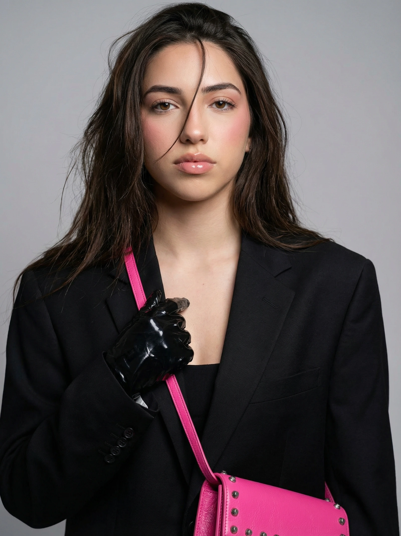 { "image_prompt": { "reference": { "source_image": "uploaded_photo", "face_identity_lock": true, "face_change": "none", "skin_tone": "preserve_exactly_from_reference" }, "subject": { "gender": "female", "pose": "close-up to medium close-up portrait", "gaze": "looking straight into the camera", "expression": "cold, strange, emotionally distant yet confident", "hair": { "color": "dark brown", "style": "long, messy, editorial texture", "details": "one loose strand falling across the face" } }, "outfit": { "top_layer": "black oversized blazer", "inner_layer": "black oversized top", "gloves": "black glossy plastic gloves", "accessory": { "type": "hot pink stud clutch bag", "brand_style": "Balenciaga-inspired", "wearing_style": "crossbody sling", "interaction": "one gloved hand lightly touching the sling" } }, "makeup": { "style": "minimal high-fashion editorial", "skin": "natural matte finish, same texture as reference", "lips": "glossy", "blush": "soft pink-toned", "eyes": "clean, subtle definition, ethereal look" }, "environment": { "location": "high-fashion studio", "background": "plain soft grey backdrop", "mood": "modern, elegant, weird, editorial" }, "lighting": { "type": "soft diffused studio lighting", "effect": "gentle highlights on skin and lips", "shadows": "very soft, minimal contrast" }, "camera": { "angle": "close-up or medium close-up", "lens_style": "editorial portrait lens", "focus": "sharp focus on face with subtle background falloff" }, "rendering": { "style": "photorealistic", "quality": "8K", "finish": "matte cinematic editorial look", "detail_level": "high-detail skin texture and fabric realism" } } }