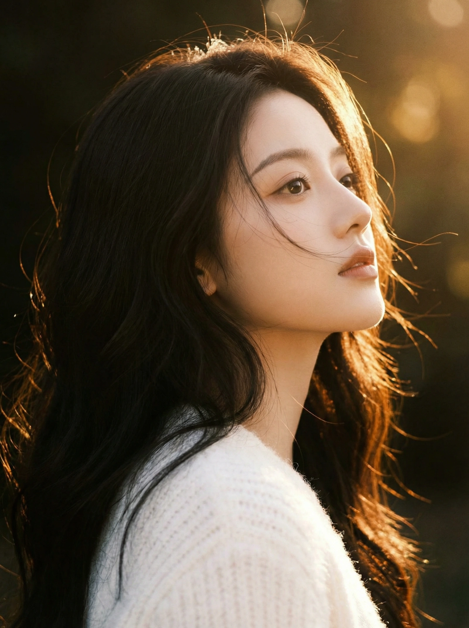 Use the attached reference image as a **facial identity reference**. Preserve the same facial structure, proportions, and likeness from the reference image, while allowing artistic cinematic lighting and styling adjustments. Do not change the person’s identity. A cinematic, highly stylized portrait of a woman captured in a side profile, looking slightly upward and away from the camera, evoking a sense of longing and quiet contemplation. Pose & Composition: Her chin is gently lifted, elongating the neck and highlighting the refined structure of her jawline and nose. Her body is angled away from the viewer in a subtle three-quarter back view, adding mystery and elegance. The framing is a close-up (head and shoulders), focusing entirely on her facial features and the natural texture of her hair. Lighting & Color Palette: Dramatic backlighting (rim lighting) illuminates her from behind, creating a soft halo around her hair with glowing highlights along her forehead, nose, and lips. Strong chiaroscuro contrast separates warm highlights from deep shadows. The color palette is dominated by golden, honey, and amber tones, reminiscent of golden hour. A soft-focus, dreamy, film-like texture with gentle film grain enhances the ethereal mood. Subject Details: She has long, voluminous, wavy hair, naturally wind-swept, with individual flyaway strands catching the light like threads of gold. Her expression is calm and serene. Her skin is **flawless, smooth, and evenly toned**, with **no moles, no freckles, no acne, no blemishes, no dark spots**. The complexion is luminous and natural, avoiding an artificial or plastic look. Her lips are soft with a natural pink hue. She wears a soft, textured garment, possibly a white faux-fur or fuzzy knit, enhancing the gentle aesthetic. Background & Atmosphere: A dark, minimalist background with subtle bokeh keeps full attention on the subject. Visible film grain adds a vintage, cinematic quality rather than a modern digital sharpness. Style keywords: cinematic portrait, reference face, golden hour lighting, rim light, chiaroscuro, flawless skin, natural beauty retouch, film grain, soft focus, ethereal, vintage aesthetic, warm tones, high contrast