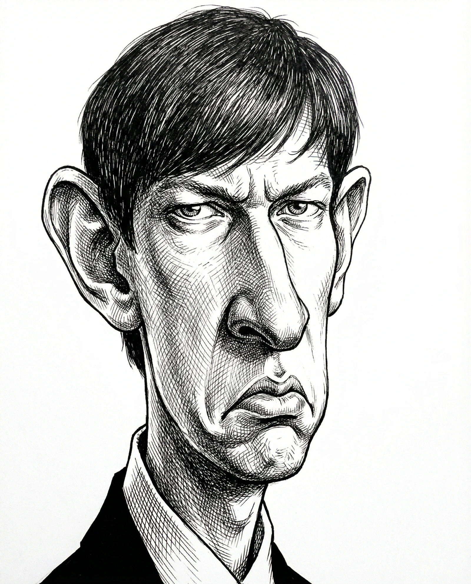 { "style": { "type": "hand-drawn caricature", "technique": "cross-hatching, fine ink lines", "mood": "serious, slightly exaggerated expression", "medium": "black and white sketch" }, "subject": { "type": "figure from reference image", "skin_texture": "detailed line work with emphasized shading", "hair": { "texture": "dense linework" }, "facial_features": { "eyes": "expressive, slightly squinting", "eyebrows": "furrowed, showing intensity", "nose": "long and defined with accentuated shading", "mouth": "exaggerated downward curve, caricatured pout", "ears": "large and prominently exaggerated", "jawline": "elongated and structured with sharp lines" } }, "composition": { "pose": "straightforward headshot with slight tilt", "framing": "upper torso visible, suit collar included", "background": "clean white, no elements" }, "clothing": { "attire": "formal suit", "details": "sharp collar lines with textured shading" }, "notes": { "emphasis": "hyper-exaggeration of facial structure", "aesthetic": "editorial political-cartoon style" } }