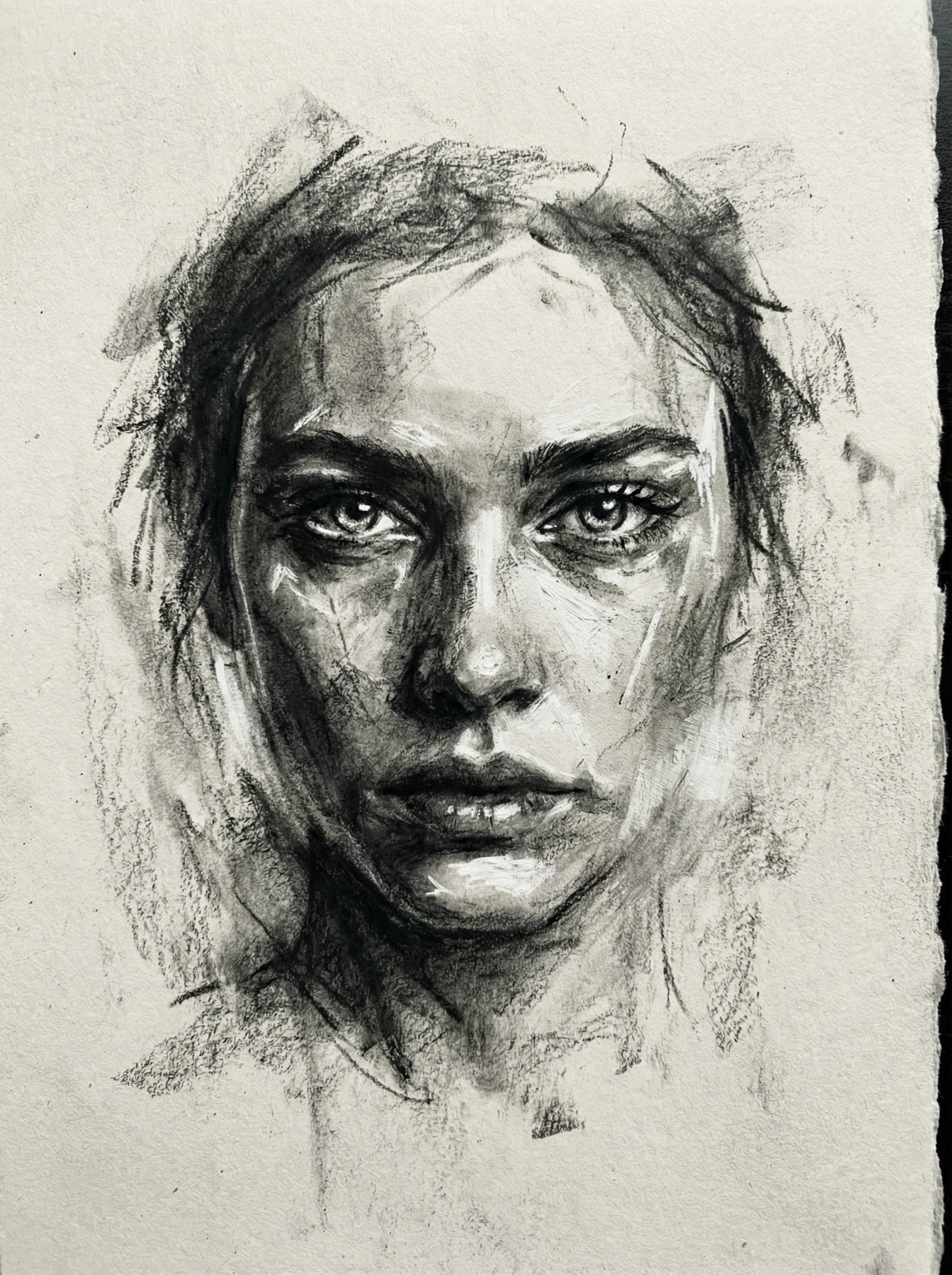 Create a charcoal sketch of a human face. The drawing should be expressive and loose, with smudged shadows created by rubbing the charcoal. The eyes should be detailed and sharp, while the hair and edges of the face fade into the rough texture of the sketching paper. The contrast should be high, with deep, matte blacks and stark whites.