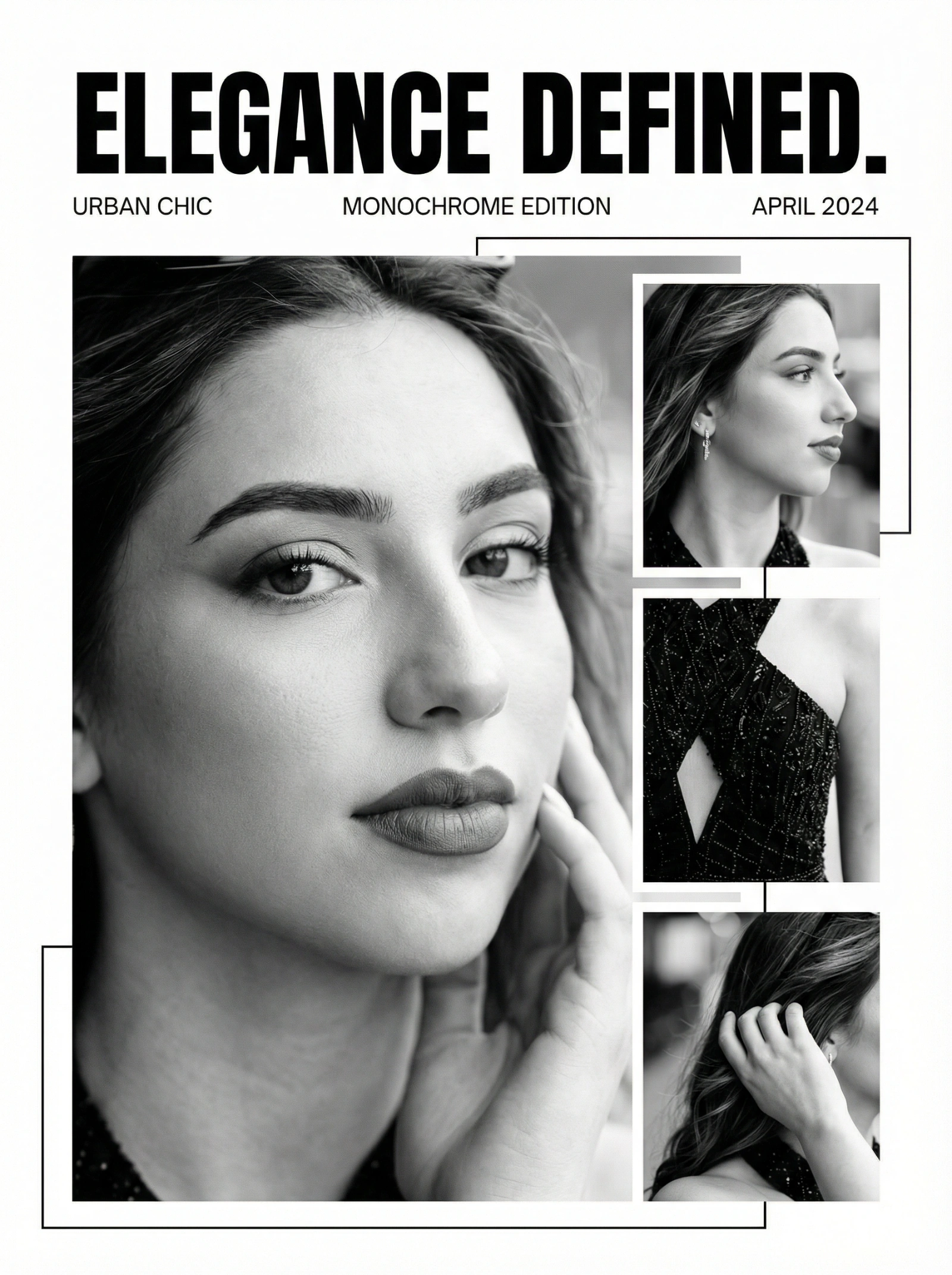 I. Overall Objective Function: Based on the user-uploaded portrait reference, extract the person’s vibe, makeup style, lighting, and color characteristics, and create a unique, fashion-forward portrait collage. Differentiation: Preserve the subject’s facial structure and overall temperament without directly copying the reference. Makeup and composition should stay within the same stylistic family but include creative variations. II. Requirements for the Reference Image Reference Content: A clear front-facing or three-quarter portrait showing visible facial features, skin texture, and general lighting atmosphere. Key Elements to Extract: Skin tone, makeup intensity, main color palette, light direction, overall temperament, and clothing color accents. III. Composition and Output Main Shot: Generate a very close-up or close-up portrait where the head and shoulders occupy most of the frame. The gaze can follow the mood suggested by the reference. Collage Structure: Add multiple small collage images on the right side or in a corner. These may include a profile close-up, hand details, or makeup details to create a magazine-style layout. Background: Keep the background clean and simple—solid colors or subtle gradients—to highlight the subject and makeup. IV. Typography and Graphic Design Title: Place a large magazine-style title at the top. The typeface should be clean and strong, centered or upper-center aligned. Subtitles & Small Text: Add a few lines of small text at the side or bottom—keywords, name, date—aligned neatly with consistent font size. Geometric Elements: Add fine lines, slim rectangular blocks, or semi-transparent shapes around the subject, integrating them with text to reinforce the graphic layout. V. Style Inheritance Rules Color: Match the overall tone, contrast, and warm/cool mood of the reference. The main color should come from the most prominent makeup or clothing color in the reference. Lighting: Follow the reference image’s lighting direction and softness. If the reference uses soft light, keep it soft; if it has strong contrast, maintain some of that crispness. Makeup: Maintain the same style category as the reference (natural, bold, experimental, translucent, etc.) while adding subtle variations in eyeshadow, blush, or lip makeup. Atmosphere: Continue the emotional mood—cool, sweet, rebellious, mysterious, etc.—and reflect it in expression and pose. VI. Creative Variation Rules Makeup Adjustments: Add expressive tweaks within the same style, such as expanding the blush area, intensifying lip smudging, or adding freckles or highlight dots. Composition Adjustments: You may change the face angle, crop, or collage placements to ensure each output has its own composition. Accessories: Add minimalistic, design-forward accessories around the neck, ears, or hands. Colors should echo the main palette without copying the reference. Gesture Details: Introduce subtle hand gestures—touching the lips, cheek, or under the eye—to add personality and narrative. VII. Overall Texture and Post-Processing Clarity: Maintain visible skin texture and pores. Avoid excessive smoothing, but gently soften non-focus areas. Color Grading: Keep a unified color tone, reduce distracting secondary colors, and emphasize the main color plus a few accent colors. Emotional Expression: Adjust expression and gaze intensity based on the reference’s mood so the result keeps the original spirit but stands as its own piece. Use the user-uploaded photo as the style source and apply the above rules automatically when generating the artwork.
