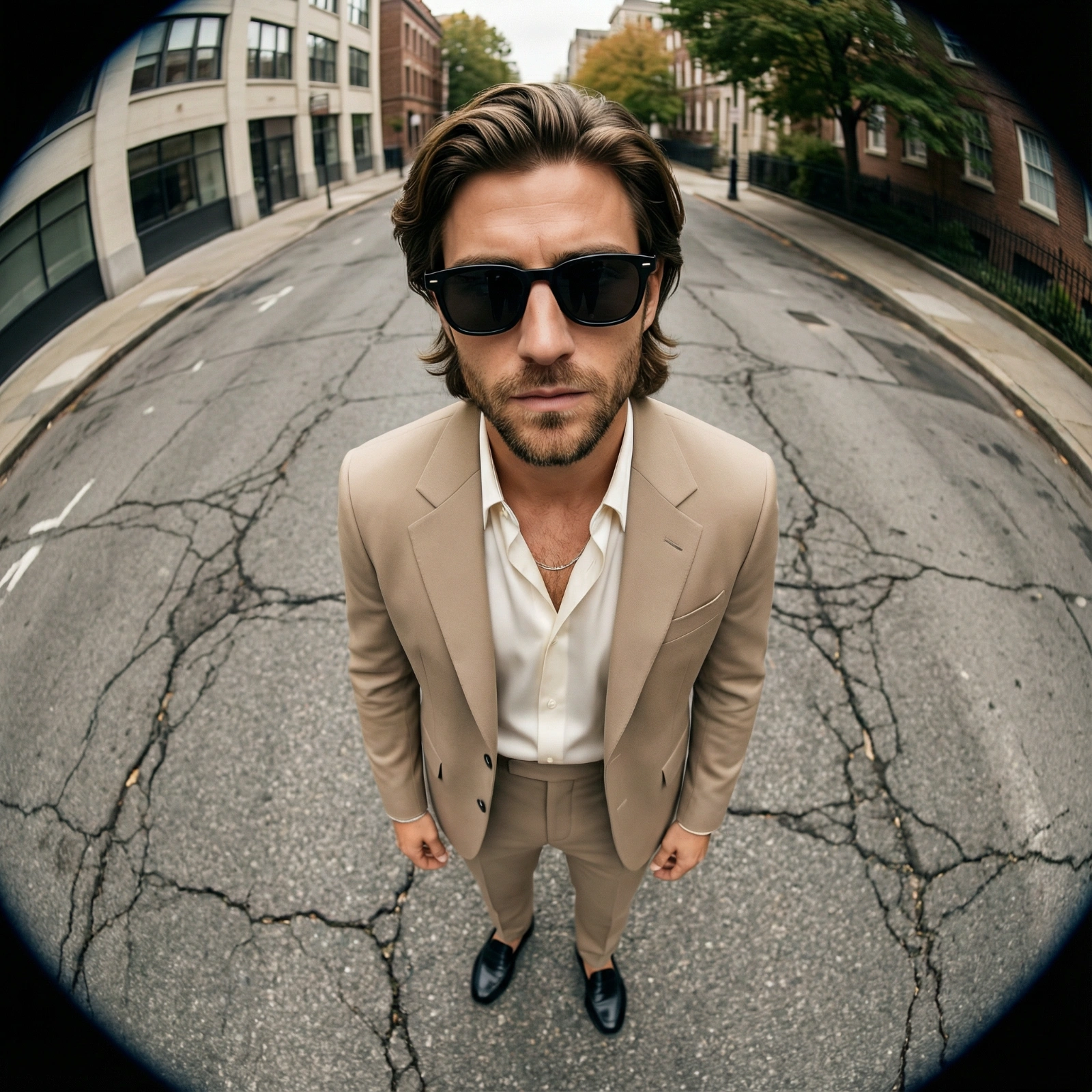 Use the attached reference image to create a high-angle, ultra-wide fisheye shot looking down at the person. The person must have the exact face and identity from the reference image, perfectly preserved. Do not alter facial features, proportions, or expression. The person is standing on a cracked asphalt road, looking directly up at the camera with a serious, confident expression. The person wears a tailored beige blazer, a silk ivory blouse, high-waisted tailored trousers, and elegant black leather loafers, complemented by minimal silver jewelry and sleek black sunglasses. Hair is styled in a sleek, shoulder-length look, clean and modern. The perspective is distorted, making the head appear large and the feet small.