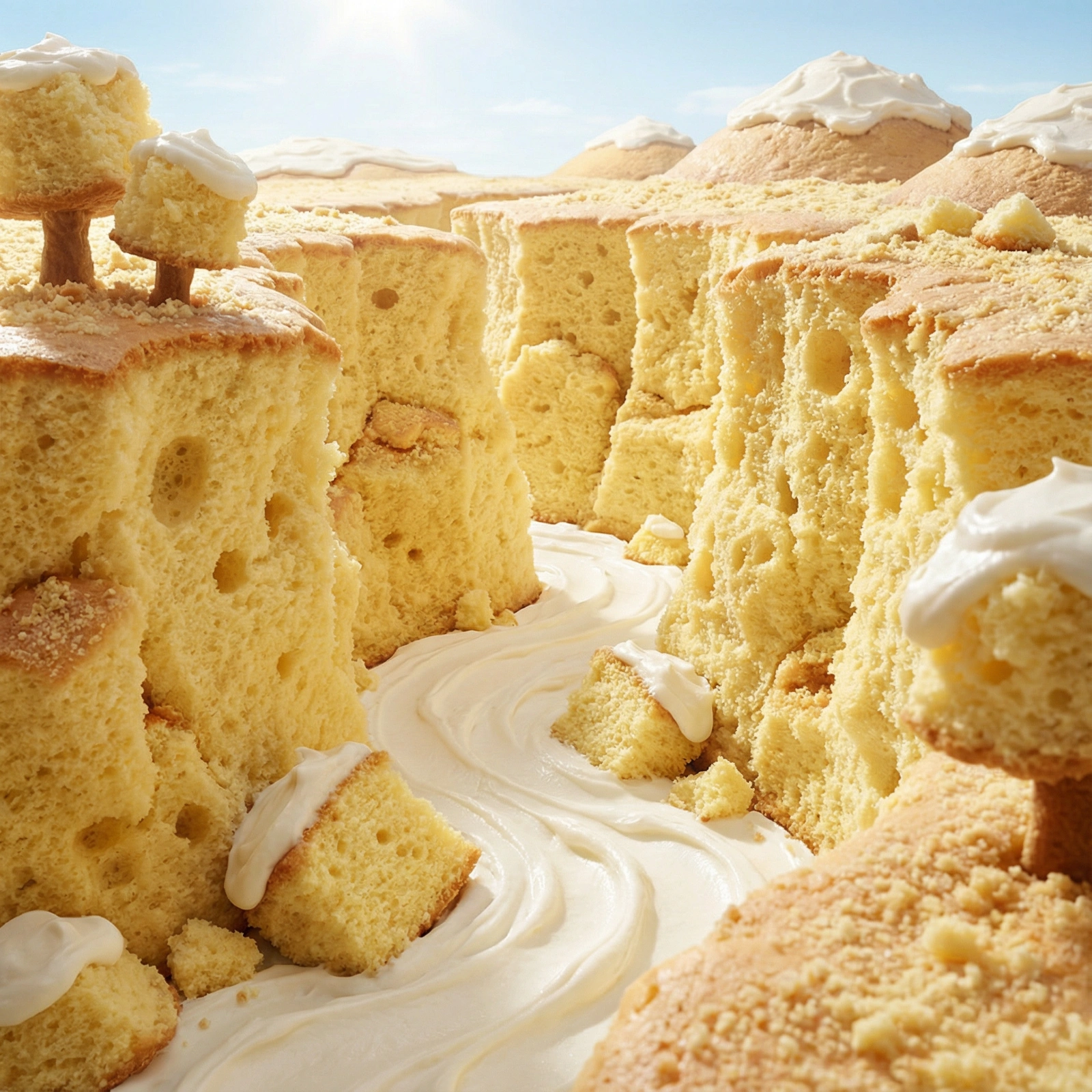 A landscape view of a canyon, but the cliffs are made of fluffy yellow sponge cake. You can see the air bubbles in the cake texture. A river of white cream flows at the bottom. The lighting is bright and airy, emphasizing the fluffiness.