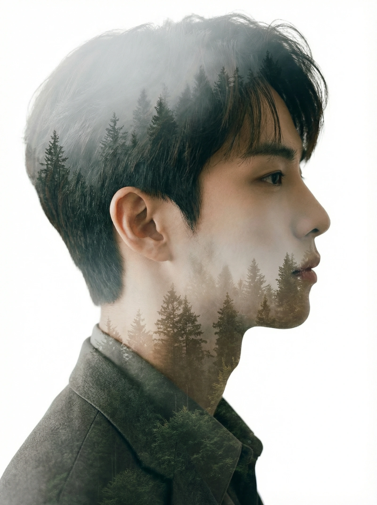 A artistic double exposure portrait. The silhouette of a man's profile is filled with an image of a pine forest in fog. The background is pure white. The transition between skin and trees is seamless.