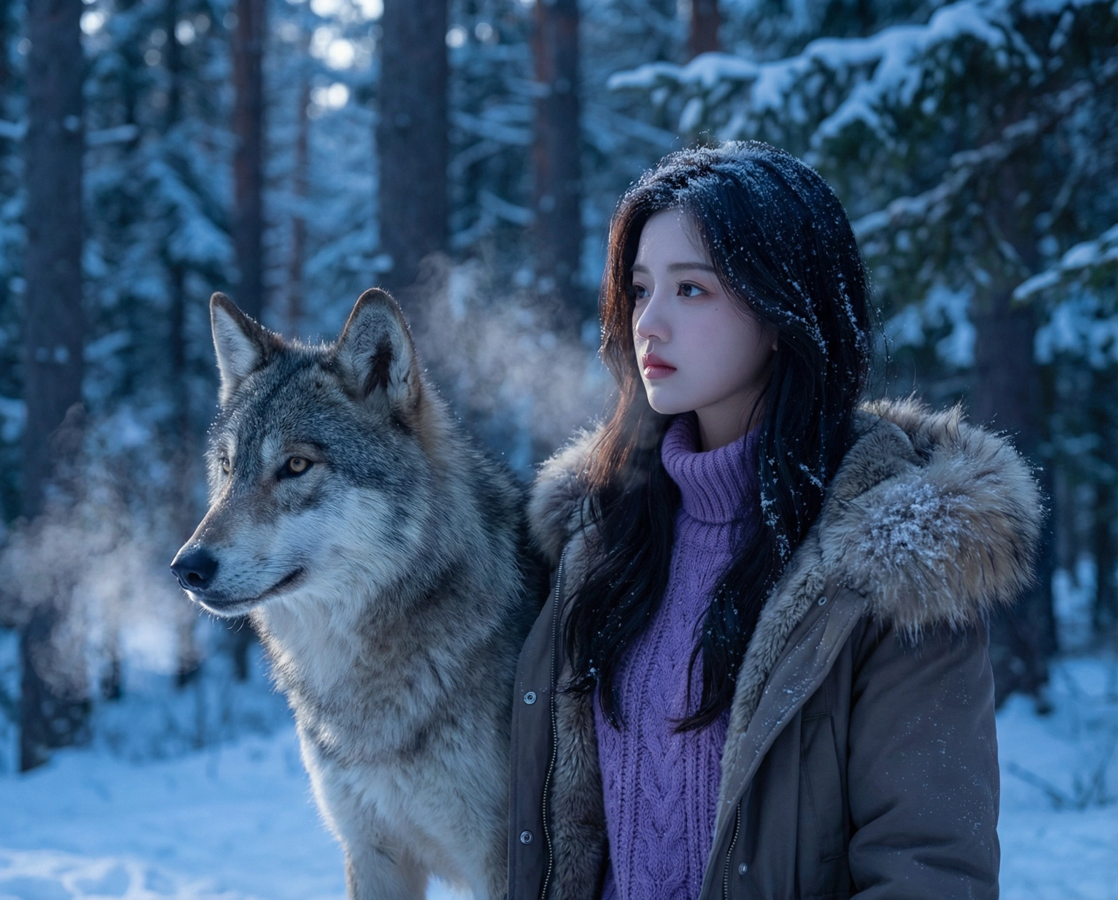 A portrait of a woman and a wolf standing side by side in a snowy forest. They are looking in the same direction. The lighting is cool and blue. Breath vapor is visible.
