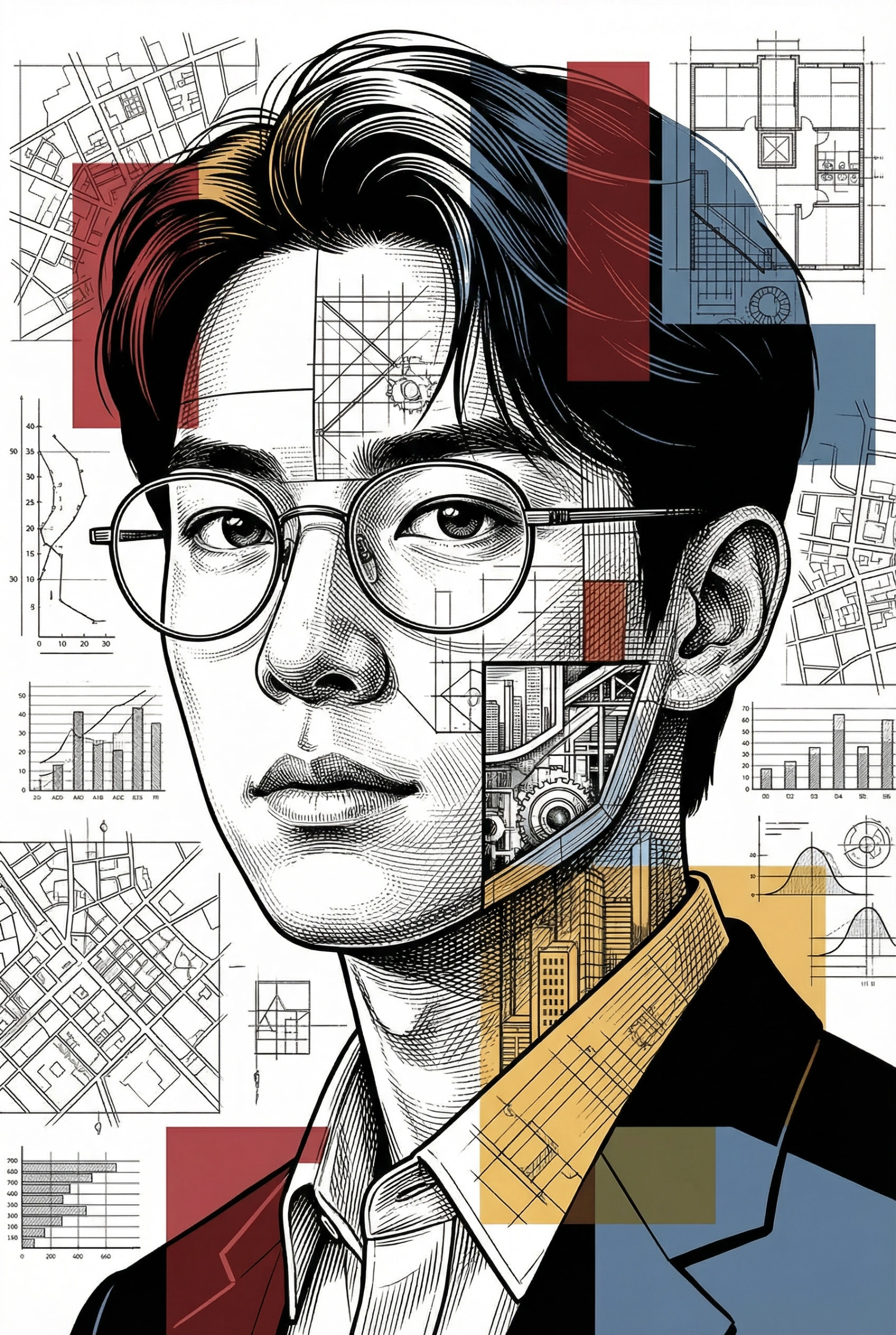 { "prompt": "Ultra-detailed stylized portrait using my face as reference. Intellectual, modernist illustration style inspired by architectural blueprints and editorial line art. Face split into layered geometric sections with visible technical diagrams, city interiors, structural grids, and abstract architectural elements embedded within the facial planes. Fine ink linework, cross-hatching, and engraving-style shading. Clean white background with dense black line drawings.\n\nBold accent colors only in selected regions: deep red, muted blue, and warm yellow, applied as flat graphic blocks and translucent overlays. Sharp, thoughtful eyes with realistic highlights, wearing thin round glasses. Minimalist yet complex composition, high contrast, crisp edges, poster-grade clarity.\n\nEditorial illustration aesthetic, conceptual portrait, futuristic intellect vibe, data visualization meets human identity. Extremely sharp, ultra-high resolution, professional magazine cover quality, no blur, no distortion, balanced symmetry.", "negative_prompt": "photorealism, soft blur, painterly strokes, oil painting, low detail, messy colors, cartoonish style, exaggerated proportions", "style": [ "modernist illustration", "architectural blueprint", "editorial line art", "engraving", "conceptual portrait", "futuristic intellect" ], "color_palette": { "accent_colors": [ "deep red", "muted blue", "warm yellow" ], "base_colors": [ "black", "white" ] }, "composition": { "background": "clean white", "symmetry": "balanced", "contrast": "high", "detail_level": "ultra-detailed", "resolution": "ultra-high" }, "quality": [ "poster-grade clarity", "professional magazine cover", "extremely sharp", "no blur", "no distortion" ] }