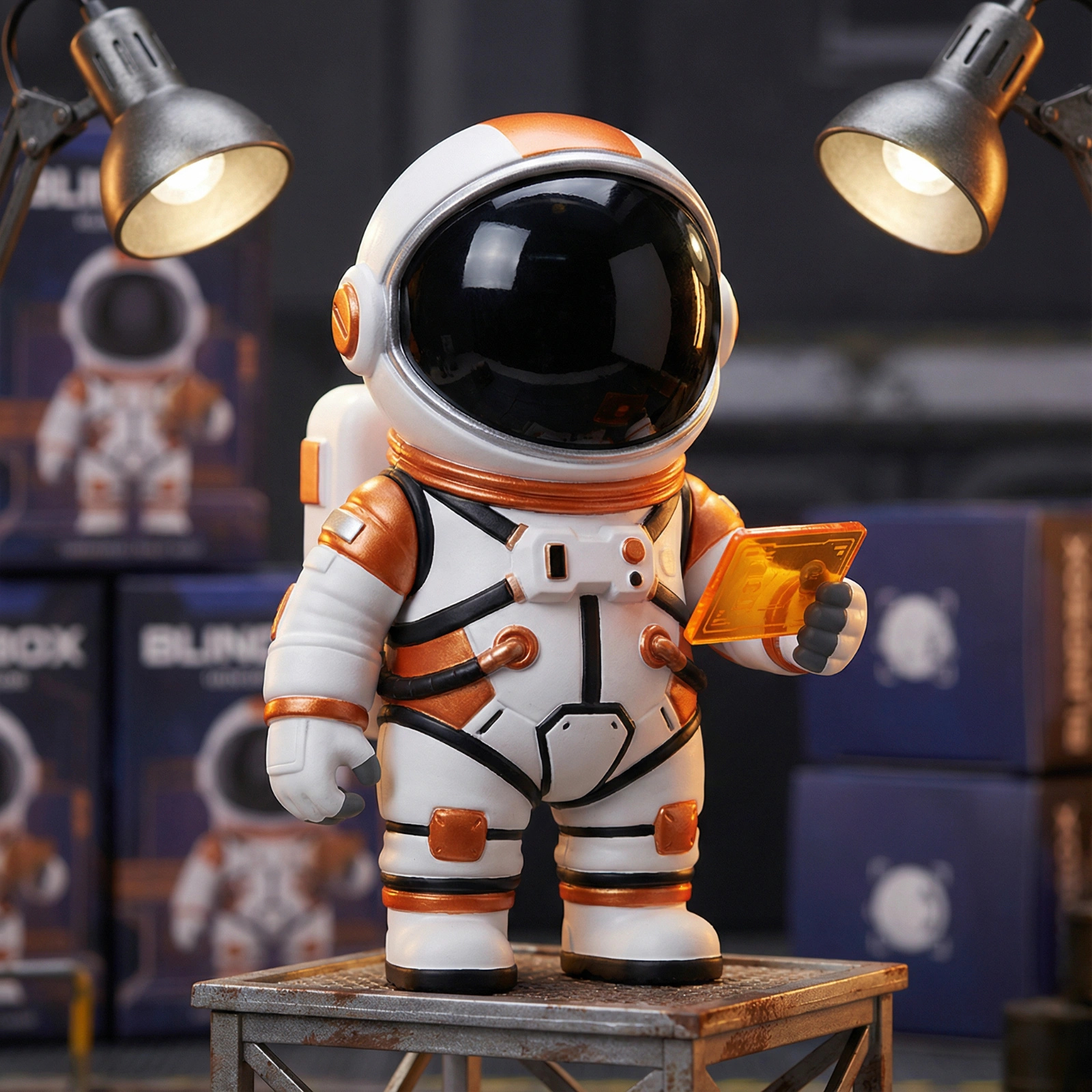 Futuristic mecha pilot character in a bulky white and orange spacesuit. Helmet visor is made of black glossy glass. Holding a tiny controller. Sci-fi anime style, blind box toy, mix of matte PVC and metallic paint textures, panel lining details, rigid pose, industrial studio lighting.
