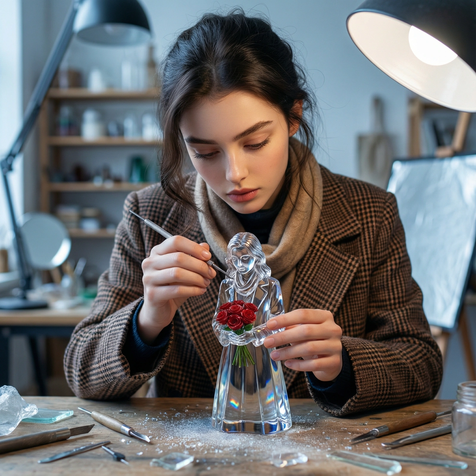 Ultra-realistic cinematic studio scene of a woman sculpting a transparent glass miniature of herself using fine carving tools. The miniature reflects studio lights with subtle refraction, identical pose and outfit. Cool-toned lighting, crystal textures, shallow depth of field, luxury artisan studio, photorealistic materials, 8K detail, 1:1 aspect ratio.