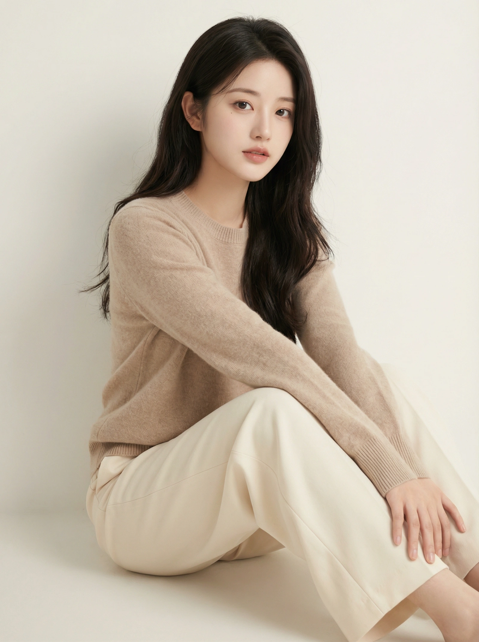 { "photo": { "type": "editorial_fashion_photo", "quality": "8k glossy photorealistic", "lens": "50mm lens", "composition": "medium portrait, slight tilt, no text, no watermark", "face": { "preserve_original": true, "reference_match": true, "description": "Maintain face identical to reference with full fidelity." }, "model_pose": { "position": "sitting on floor", "legs": "knees bent casually", "hands": "hands resting on thighs", "expression": "soft relaxed" }, "wardrobe": { "top": { "type": "beige cashmere sweater" }, "pants": { "type": "cream wide-leg trousers" } }, "textures": { "emphasis": [ "cashmere fabric softness", "smooth trousers", "light falloff", "soft shadows", "natural wrinkles" ] }, "environment": { "backdrop": "off-white matte backdrop", "lighting": { "style": "soft editorial lighting", "key_light": "front softened key", "fill_light": "low balanced fill", "shadows": "soft hazy shadows" } }, "color_grade": { "type": "clean cinematic", "balance": "neutral bright tones" } } }
