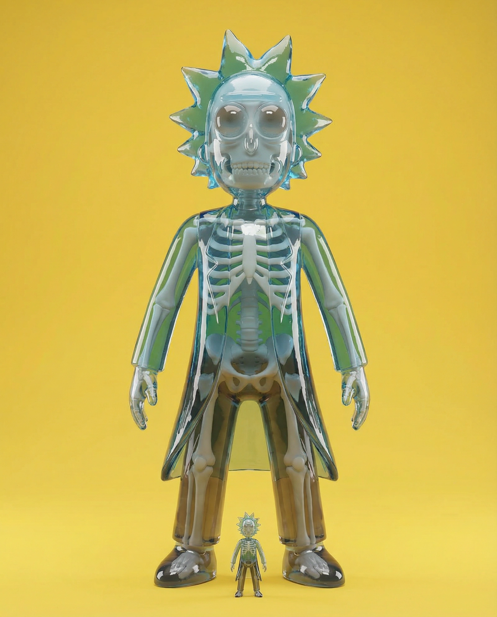 Turn this figure into a minimalistic glossy translucent toy figure made of jelly with the skeleton inside visible, keeping its physical and colour details, extremely detailed texture, product photoshoot, solid yellow background