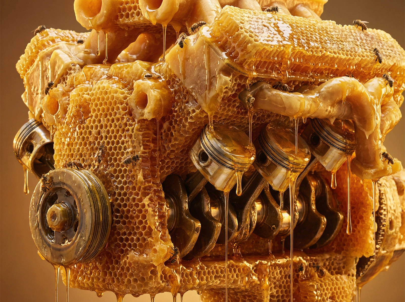 A complex V8 car engine where all the metal parts are replaced by dripping golden honeycomb and beeswax. Bees are crawling on the pistons. Amber lighting, macro detail, sticky texture visualization.