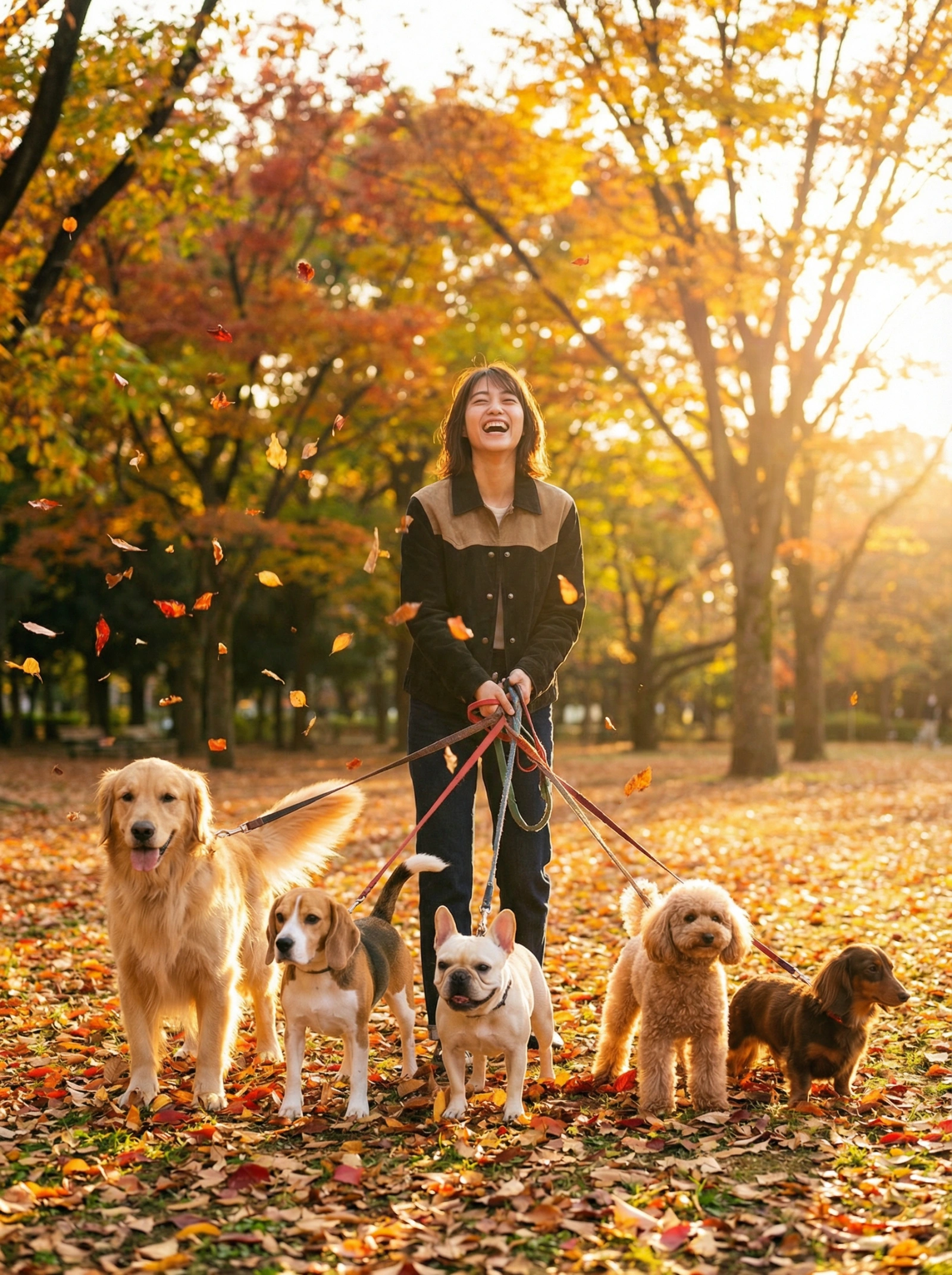 A wide shot of a person walking five different dogs in an autumn park. The leashes are tangled. The person is laughing. Leaves are falling. The lighting is warm golden hour sun.