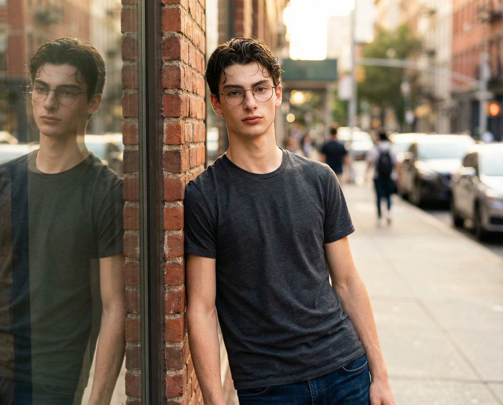 A realistic cinematic portrait of a young man with a short beard and styled brown hair, wearing thin-frame round glasses, a charcoal grey t-shirt, and dark blue jeans. He is leaning casually against a red brick wall on a city sidewalk. To his left is a large glass window showing his clear reflection. The lighting is warm golden hour sunlight, creating a soft glow. Shallow depth of field with a blurred city street background, 85mm lens, high resolution, natural textures.