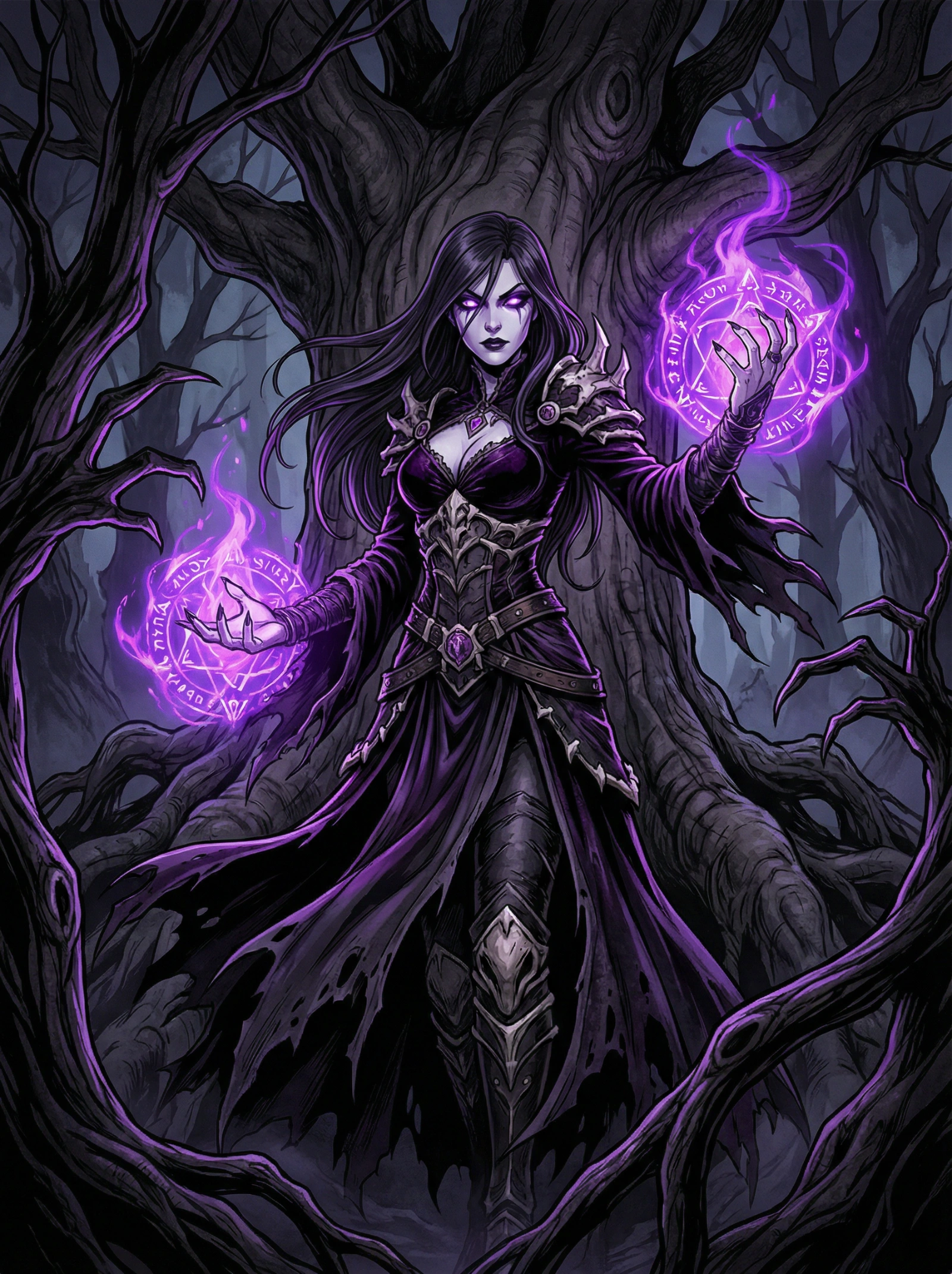 Illustrate a Dark Fantasy anime character. A powerful sorceress stands in a shadowed, twisted forest. She is illuminated only by the purple magical runes floating around her hands. Her design is gothic, with dark robes and pale skin. The art style should use deep blacks and vibrant magical highlights to create a high-contrast, ominous atmosphere.