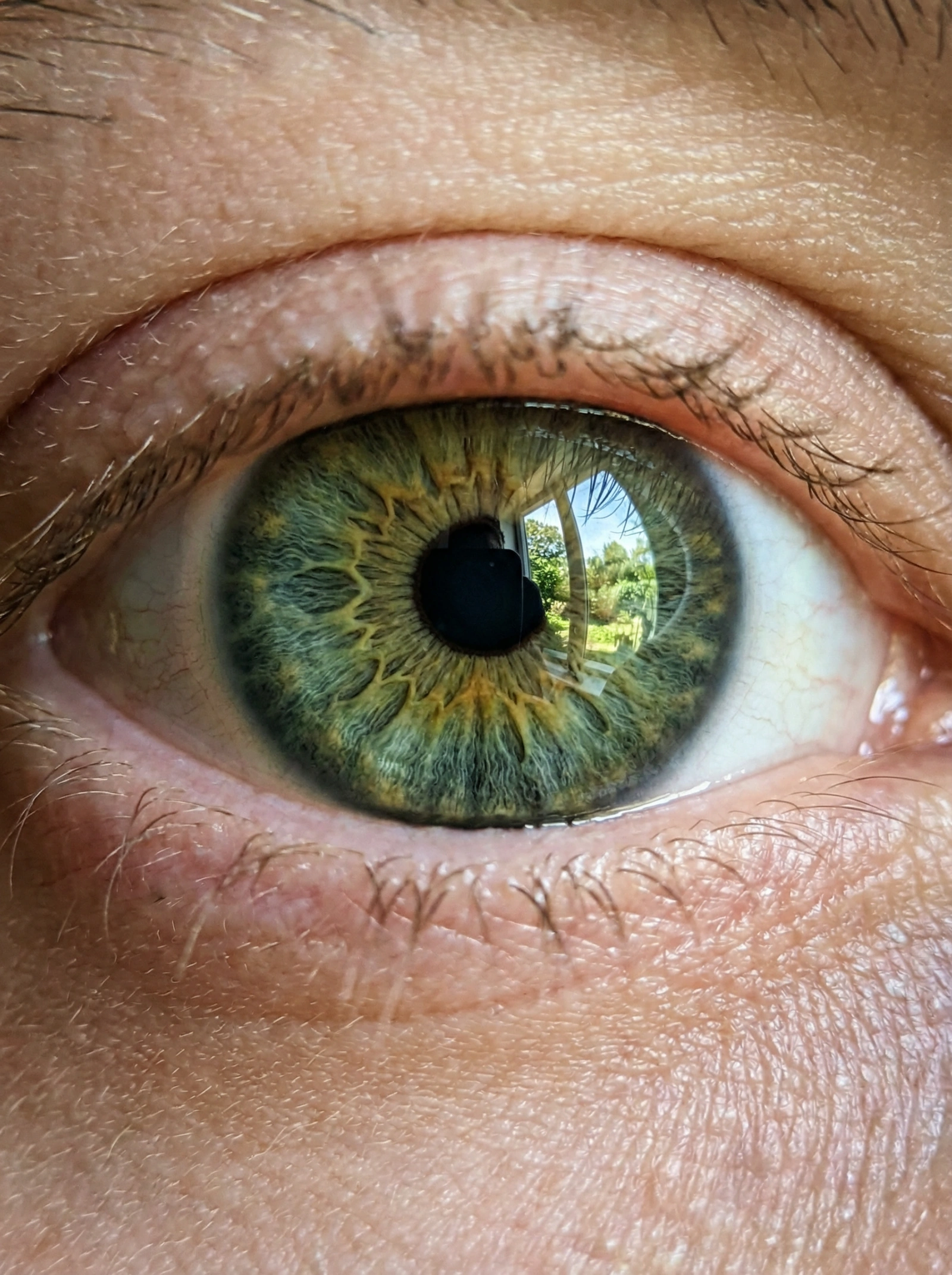 Create an extreme macro close-up of a human eye. Detail the intricate patterns of the green iris and the reflection of a window in the pupil. The skin texture around the eye should be visible and realistic.