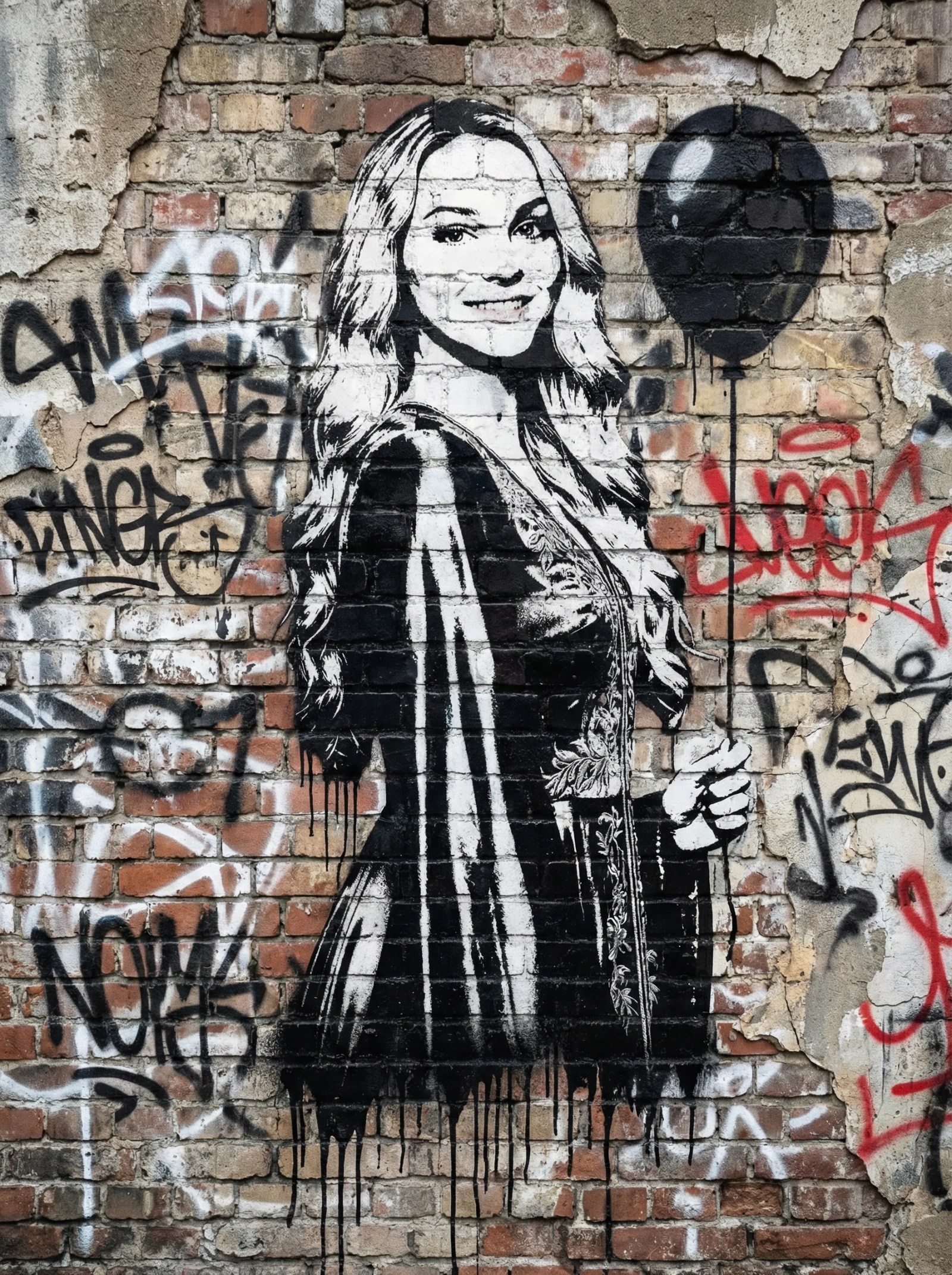 A high-contrast spray paint stencil portrait on a crumbling brick wall. The style mimics guerrilla street art. The subject is a child holding a balloon. There are drips of paint and graffiti tags in the background.