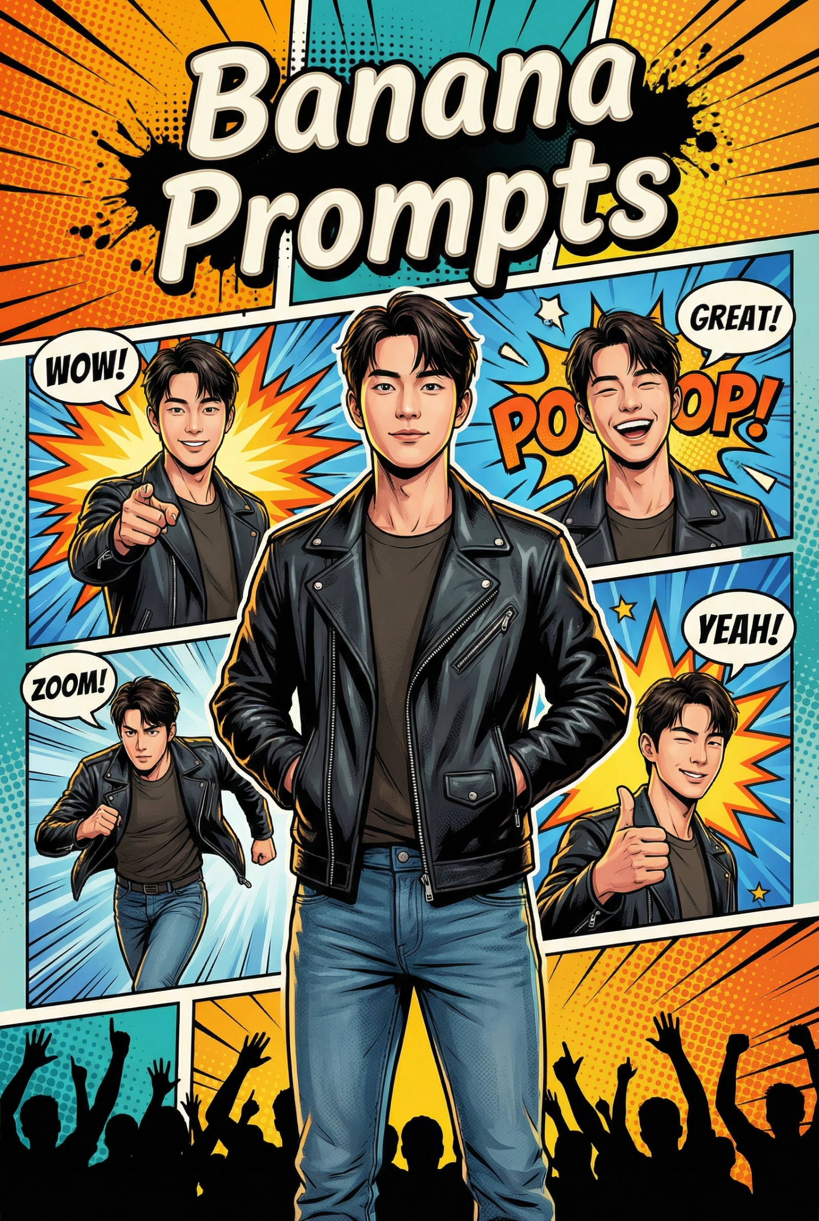 { "image_type": "comic_poster_illustration", "reference_image": { "use": true, "identity_preservation": "strict", "face_similarity": "high", "no_face_morphing": true }, "canvas": { "aspect_ratio": "2:3", "resolution": "4K", "orientation": "vertical poster" }, "title_text": { "text": "Banana Prompts", "position": "top_center", "style": "bold comic title lettering", "font_look": "thick hand-drawn comic font", "color": "cream white with black outline", "effects": [ "slight 3D emboss", "comic ink shadow", "subtle halftone texture" ] }, "main_character": { "subject": "man using my reference image", "pose": "confident heroic stance, hands in jacket pockets", "expression": "calm confidence, slight smirk", "outfit": { "jacket": "black leather jacket", "tshirt": "dark neutral tee", "jeans": "blue denim", "style": "modern casual hero" }, "lighting": "dramatic comic-style rim lighting", "render_style": "semi-realistic comic illustration" }, "comic_panels": [ { "position": "top_left", "pose": "pointing toward the viewer", "expression": "friendly confident smile", "speech_text": "WOW!", "panel_effect": "burst explosion background" }, { "position": "top_right", "pose": "laughing head tilt", "expression": "joyful laugh", "speech_text": "GREAT!", "panel_effect": "comic sound effect pop" }, { "position": "bottom_left", "pose": "running forward action pose", "expression": "focused determination", "speech_text": "ZOOM!", "motion_lines": true }, { "position": "bottom_right", "pose": "thumbs up", "expression": "playful wink", "speech_text": "YEAH!", "panel_effect": "starburst" } ], "background": { "style": "comic book panels collage", "colors": [ "orange", "yellow", "blue", "teal" ], "elements": [ "halftone dots", "ink splashes", "dynamic action lines", "comic explosion shapes" ], "bottom_scene": "silhouetted cheering crowd with raised hands" }, "art_style": { "genre": "modern comic book / graphic novel", "influences": [ "Marvel comic covers", "DC character posters", "Pop-art illustration" ], "line_work": "clean bold ink outlines", "shading": "soft painterly with halftone texture" }, "render_quality": { "detail_level": "high", "sharpness": "crisp", "color_grading": "vibrant cinematic", "final_look": "viral social media poster" }, "constraints": { "no_blur": true, "no_extra_faces": true, "no_watermark": true, "no_random_text": true }, "negative_prompt": [ "low quality", "blurry", "extra limbs", "distorted face", "bad anatomy", "realistic photo style", "3D render", "watermark", "logo artifacts" ] }