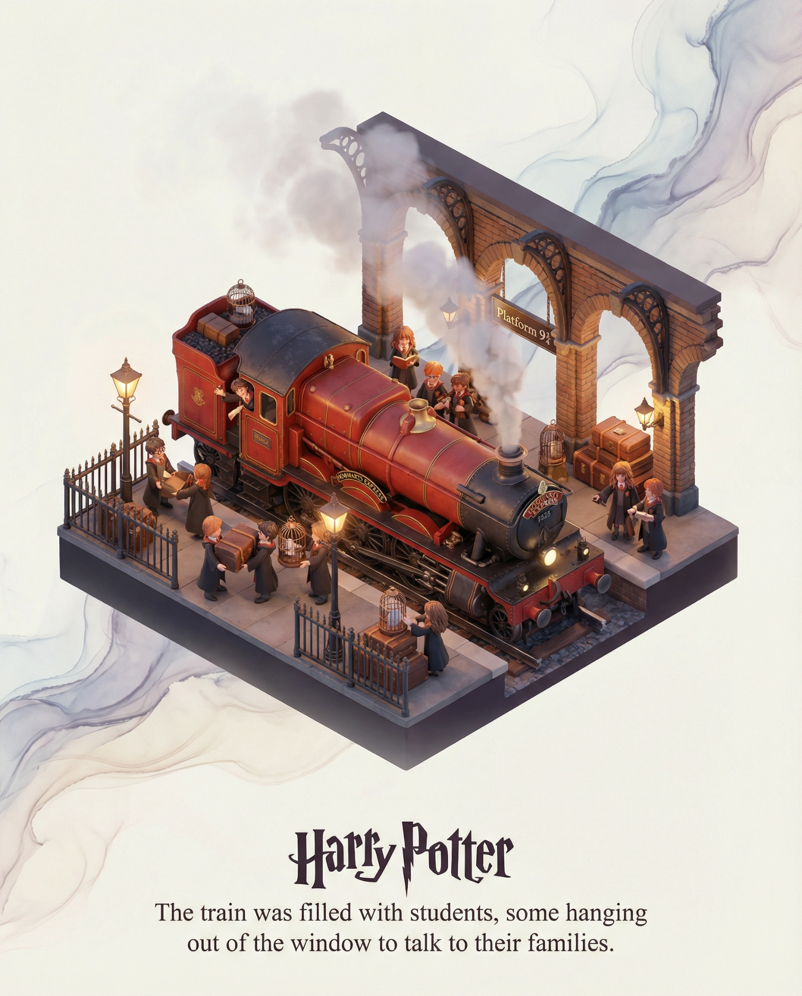 Please design a high-quality 3D poster for the novel [Harry Potter]. The selected scene is [The Hogwarts Express steam train waiting at Platform 9¾ with students loading trunks]. In the center of the image, construct this scene as an exquisite isometric 3D miniature model. The style should adopt the delicate, soft rendering style of DreamWorks Animation. You need to restore the architectural details of the brick archways, the steam engine's mechanics, and the bustling atmosphere naturally blended into the model's lighting and shadow. Regarding the background, do not use a simple plain white base. Please create a void environment around the model with faint ink wash effects and flowing light mist. The tones should be elegant, giving the image a sense of breathing room and depth, highlighting the preciousness of the central model. Finally, for the typography at the bottom, generate English text. Display the title [Harry Potter] in the center, using a font design that matches the original work's style. Directly below the title, typeset the classic line: "The train was filled with students, some hanging out of the window to talk to their families." using an elegant serif font. The overall layout should be as exquisite and balanced as a high-end museum collection plaque.