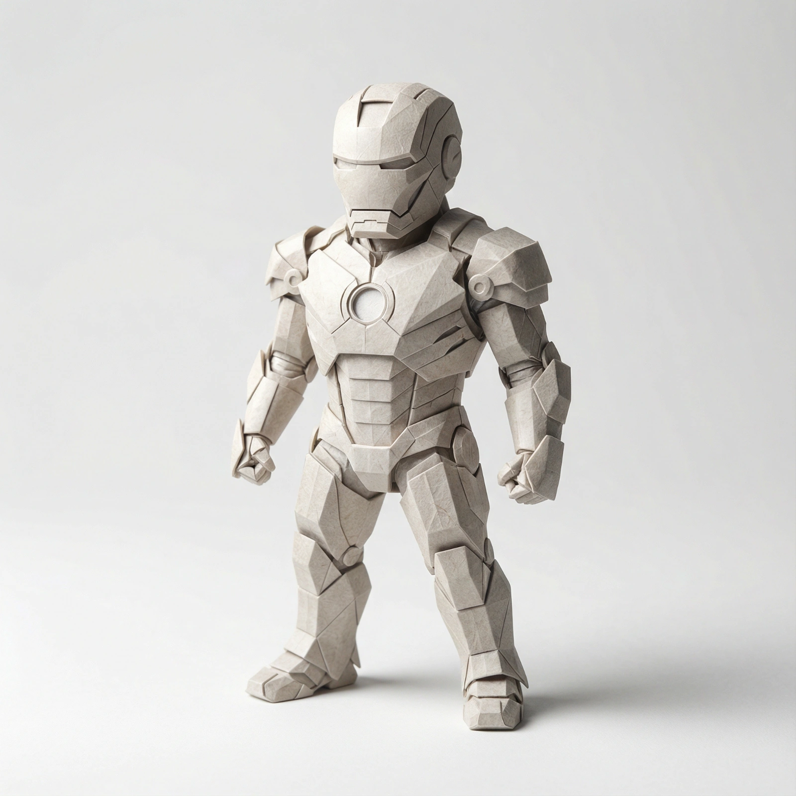 A hyper-detailed origami version of [Iron Man], folded from high-quality paper with crisp edges and realistic paper texture. Intricate folds capture the recognizable helmet contours and arc-reactor geometry in simplified geometric form. Placed on a clean studio surface with soft shadows. Minimalist collectible art style, photorealistic. 1080x1080 square.