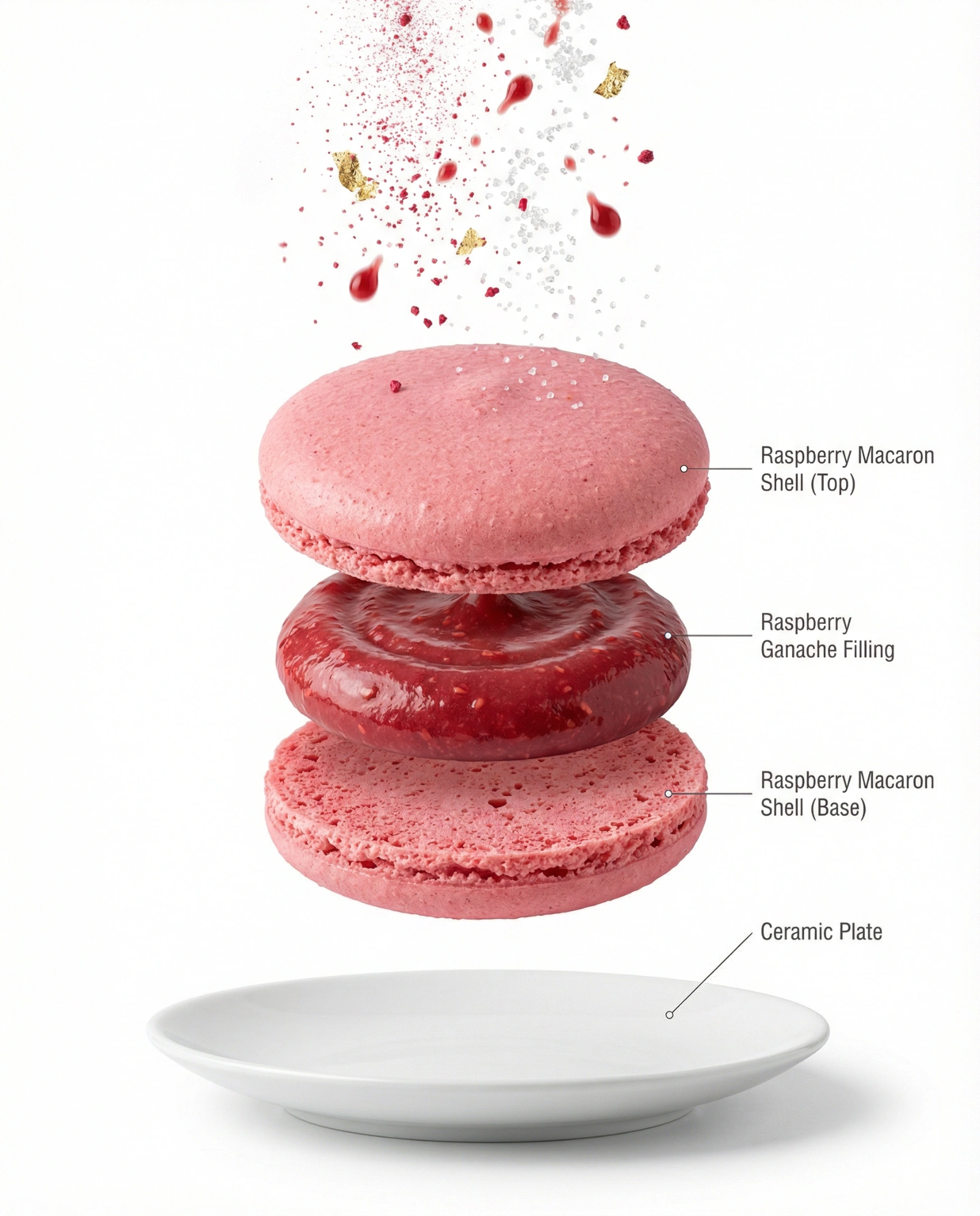 Create a hyper-realistic exploded vertical infographic composition of [Macaron]. At the top, characteristic particles, droplets, or garnishes associated with the food, frozen mid-air. Below it, the primary surface or topping layer with rich texture and realistic material detail. Underneath, the core ingredient layer showing structure, depth, and natural variation. Below that, the supporting base or interior layer, slightly separated to reveal construction. At the bottom, a minimal plate, bowl, cup, or base appropriate to the food’s presentation. Pure white background, soft studio lighting, subtle shadows beneath each floating element, ultra-sharp focus, DSLR macro photography, clean infographic text labels with thin pointer lines, premium editorial food photography aesthetic, 8K quality.
