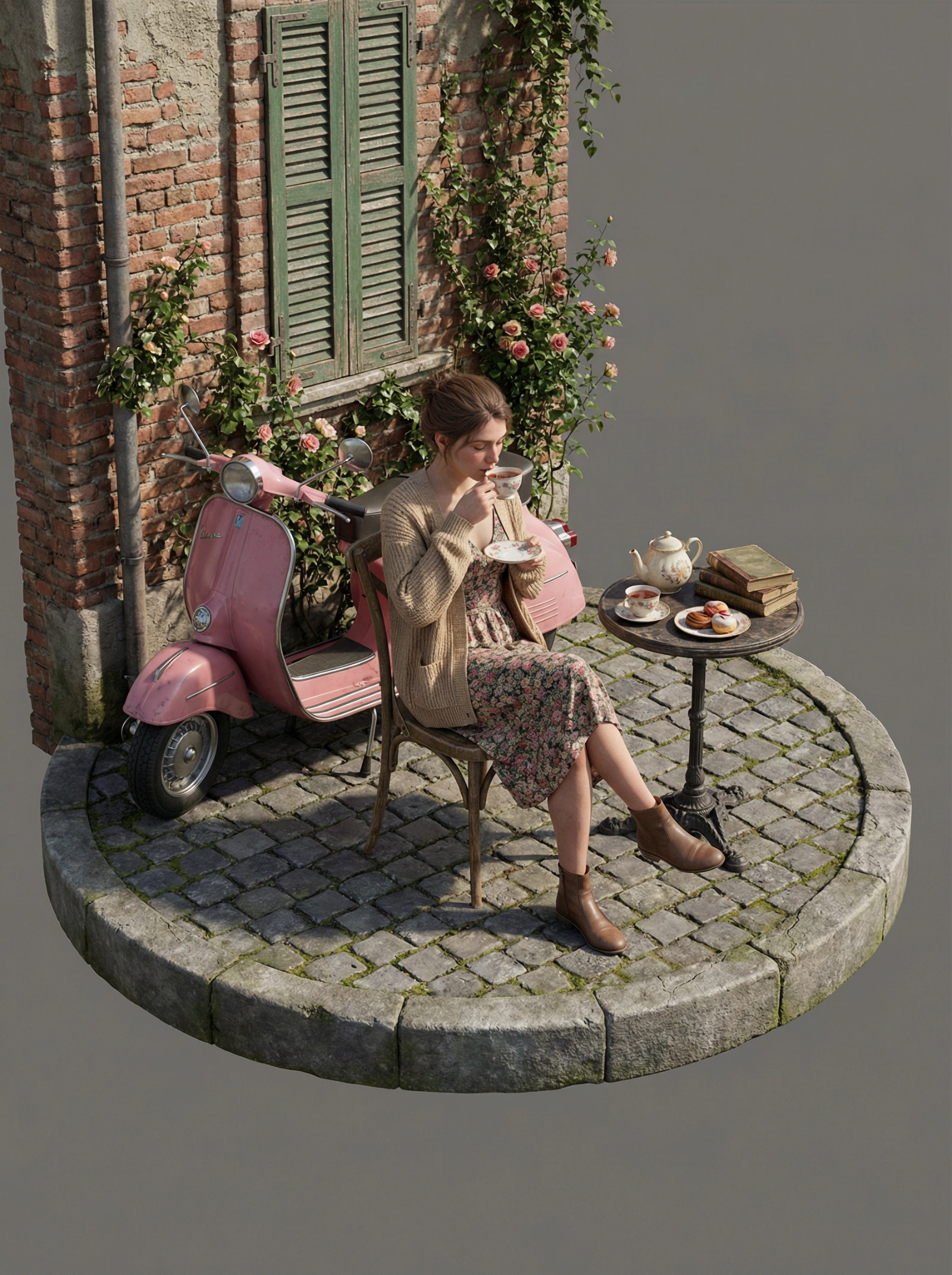 Concept: A hyper-realistic 3D isometric view of a cobblestone European café street corner scene on a circular base. Subject (Visuals): A full-body, realistic human young woman wearing a floral dress and knitted cardigan, holding a teacup and saucer. - Texture Rule: The subject must have "Living Human Skin" texture (subsurface scattering, pores, natural imperfections). - Important: She is NOT a toy/doll. She looks like a real person inserted into the scene. - Pose: Sitting on a wooden chair, legs crossed naturally, sipping tea. Composition & Scale (Crucial): - Camera: Isometric wide shot (Full view). ensure the entire circular base, the subject, and all props are visible within the frame. - Proportions: PERFECT RELATIVE SCALE. Environment: A realistic section of a weathered brick wall with green shutters and climbing flowers behind the subject. - Material: Real weathered textures (brick, cement, wood), not painted model textures. Props: - Vintage pink Vespa (Real metal and chrome texture). - Teapot, teacup, small table with books (Real food and object texture). - *Note:* Ensure all props are present and grounded on the base. Technical Specs: Unreal Engine 5 render style, 8k resolution, global illumination, raytracing, sharp focus on the entire scene (deep depth of field), solid neutral grey background. Negative Prompt: Toy, plastic, doll, action figure, clay, resin, shallow depth of field (blur), close-up, cropped, distorted proportions, giant head, cartoonish, missing limbs, unfinished.