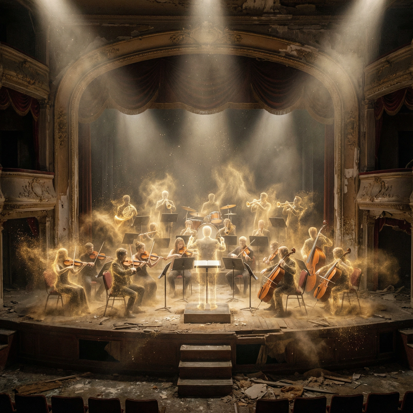 An abandoned, dusty concert hall. On stage, an orchestra is playing, but the musicians are invisible, represented only by floating instruments and glowing gold dust particles swirling in the shape of human forms playing them. Volumetric spotlighting.