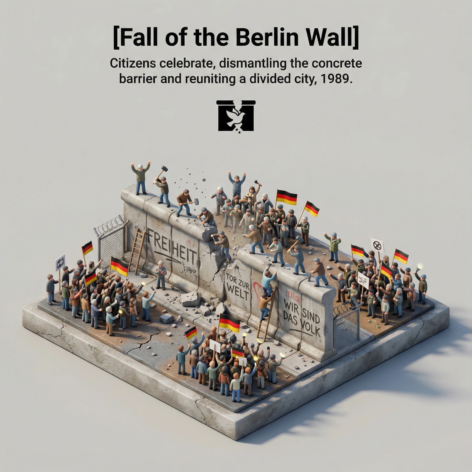 Present a clear, 45° top-down isometric miniature 3D cartoon scene of the historical event [Fall of the Berlin Wall], featuring its most iconic moment: [people standing on the wall, breaking it apart with hammers as crowds gather below]. Use soft refined textures, realistic PBR materials, and gentle lifelike lighting. Create a small raised diorama-style base that includes the most recognizable elements of this moment, along with tiny stylized characters if needed (no facial details). Use a clean solid [light concrete gray] background. At the top-center, display “[Fall of the Berlin Wall]” in large bold text, directly beneath it show a short descriptive subtitle in medium text, and place a small official symbol or simplified icon below the subtitle. All text must automatically match the background contrast (white or black). Composition: perfectly centered layout, square 1080x1080, ultra-clean, high-clarity diorama aesthetic.