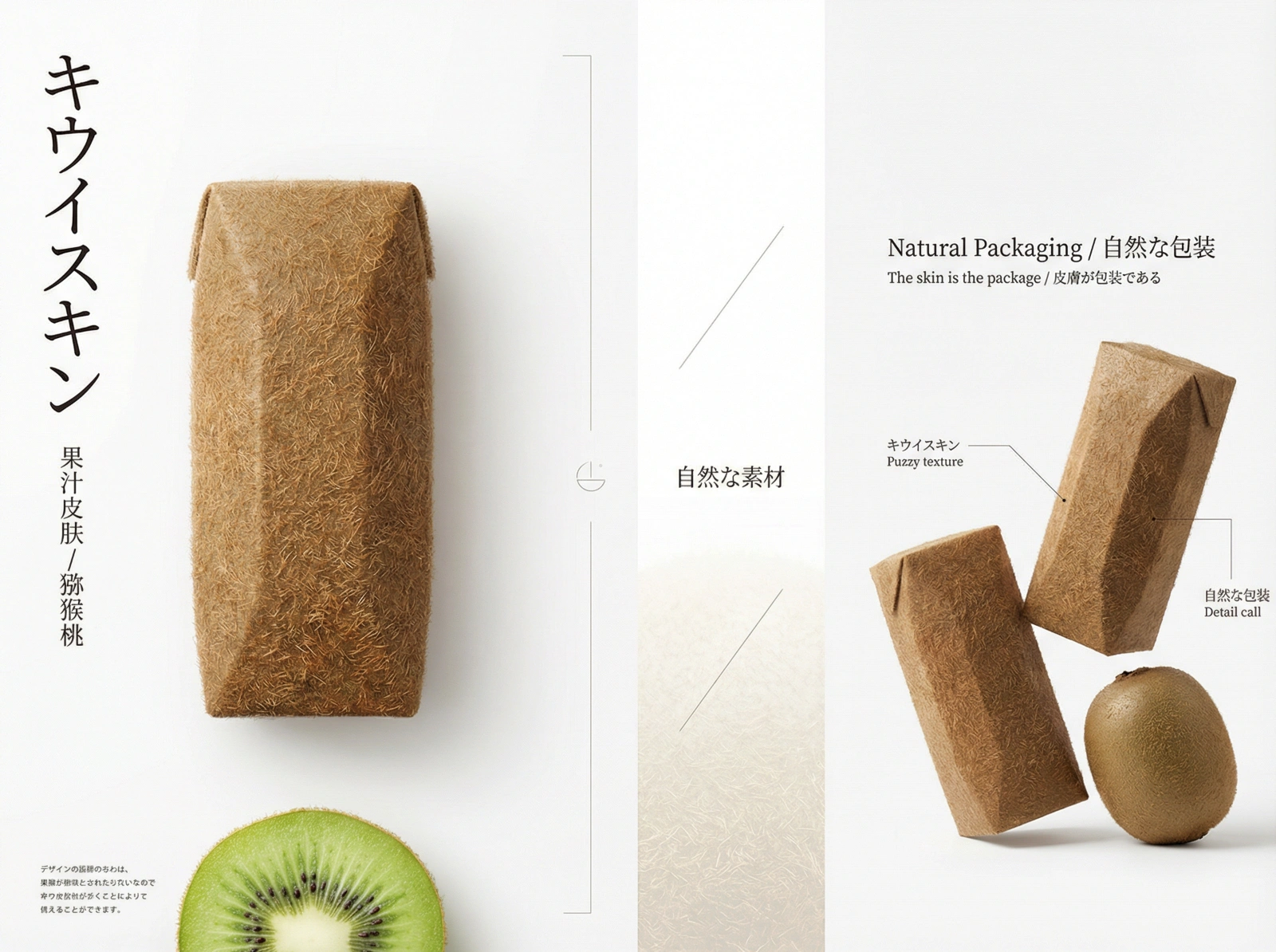 1、🥝 Prompt: Premium Japanese-style product poster in 16:9 landscape format, editorial design showcasing kiwi juice skin packaging concept with sophisticated visual storytelling: LEFT SIDE (40% of canvas): - Hero product: One large kiwi juice skin package displayed vertically with dramatic soft lighting, showing ultra-realistic kiwi peel texture wrapped around rectangular container, fuzzy brown skin with thousands of fine visible hair-like fibers covering entire surface, rough natural texture, brown color with subtle variations, looks exactly like real kiwi skin stretched over package - Below: One cross-sectioned fresh kiwi showing vibrant green creamy flesh with black seeds radiating from white center - Japanese typography vertically aligned: "キウイスキン" (Kiwi Skin) in elegant thin gothic font - Subtitle: "果汁皮肤 / 猕猴桃" in refined style - Small design philosophy text in Japanese CENTER (30% of canvas): - Generous white negative space (Ma - 間) - Minimal geometric elements: delicate thin lines - Floating text: "自然な素材" (natural materials) - Subtle minimalist brand mark - Very subtle kiwi fuzz texture pattern in background (low opacity) RIGHT SIDE (30% of canvas): - Two kiwi juice skin packages arranged artistically at different angles and heights - One whole fresh kiwi with natural fuzzy brown skin - Typography: "Natural Packaging / 自然な包装" - Tagline: "The skin is the package / 皮膚が包装である" - Detail callouts pointing to fuzzy hair texture DESIGN PRINCIPLES: Abundant white space, asymmetrical balance, Wabi-sabi aesthetic, Muji/Noritake editorial minimalism COLOR PALETTE: brown kiwi tones, pure white background, bright green accent from flesh PHOTOGRAPHY: Soft diffused studio lighting, ultra-sharp macro details showing fuzzy texture, photorealistic rendering CRITICAL: The kiwi skin packaging must look incredibly realistic - actual organic fuzzy brown texture with thousands of tiny brown hairs, rough natural appearance, NOT plastic high-end Japanese product poster, gallery quality