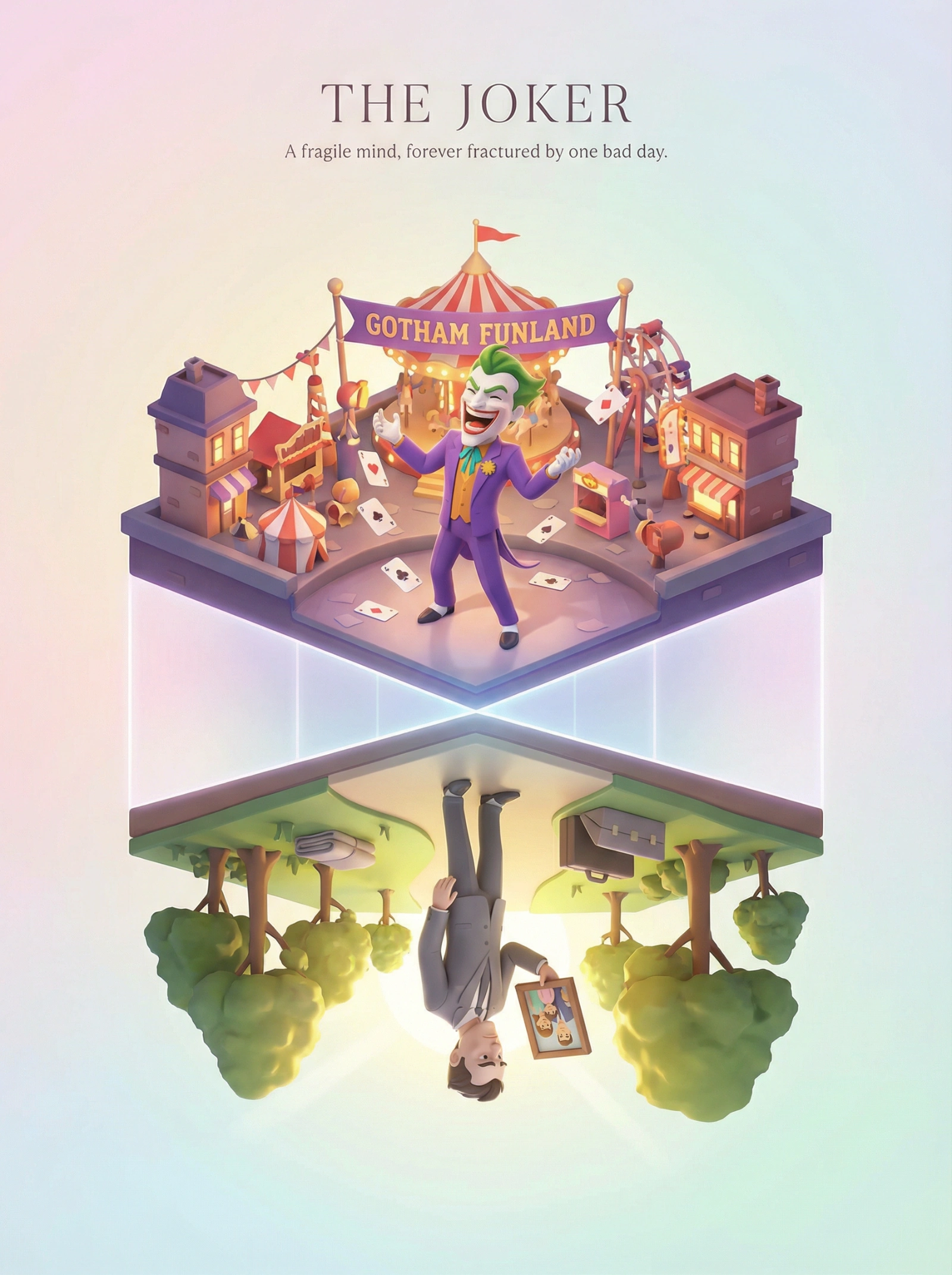A clear floating top-down isometric 3D cartoon diorama scene with a vertical inverted composition: Scene(cute): the upper half shows [Subject]'s most iconic defining scene - prefer full shot in outdoor. The lower half reveals [Subject]'s contrasting opposite realm. CRITICAL: the lower world must be geometrically flipped upside-down. The boundary floor is shared. Interpret [Subject]'s narrative essence: place the protagonist that captures their defining choice or transformation — the same figure appears in both realms, but emotionally inverted. Place 2 distinct symbolic objects naturally within their respective worlds, echoing each other across the boundary to suggest what was abandoned or gained. Two realms merge as one continuous form — the boundary transitions through ground, subtle color/lighting shift, maintaining structural integrity. No visible dividing line, no frame, no mask — the isometric architecture remains crisp and clear while flowing seamlessly into its inverted reflection. Composition: clean, dramatic upside-down multiverse. Open spatial vista, not enclosed by walls. Background: a bright, soft gradient background that seamlessly blends into the scene. Lighting: contextually appropriate. Render: high poly with soft shading. PBR material, refined textures, intricate and delicate detailed, vivid colors. hd. Typography(top-center, film grade): design a prominent title "[Subject]" in slim font with nice serif(Auto translate to English, remove []) → a poetic, insightful subtitle that distills the story's deepest truth or tension into one profound line. Create clear visual hierarchy through scale and weight contrast. auto line wrap. Enhance: professional cinematic lighting with intentional key/fill/rim setup; dynamic pose; visual depth. Avoid: [border-cut, hard cartoon outlines, over-saturated, smudged/distorted boundaries, warped architecture. Ceiling]. [Subject] = Joker