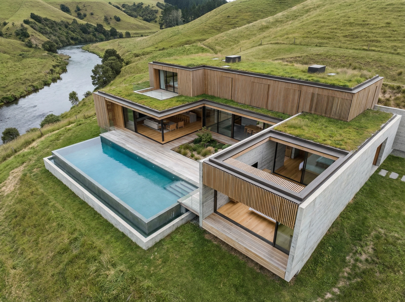 Create a photorealistic bird's-eye view of a modernist mansion inspired by the architecture of Kengo Kuma. The design utilizes a sophisticated palette of natural wood slats and fair-faced concrete. The building features a living green roof that blends seamlessly into the surrounding grassy hills. A large infinity pool extends towards a river. The integration of architecture and nature is the key theme, with transparency and natural materials dominating the design.