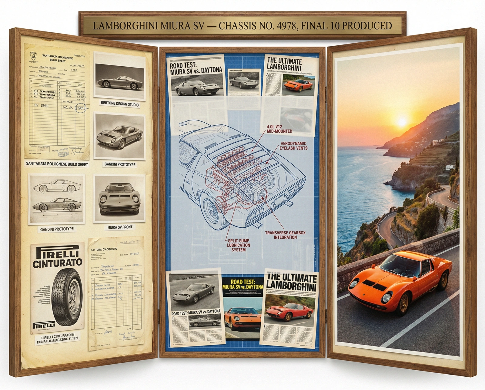 A marque historian's documentation board for Lamborghini Miura P400 SV — Final Evolution, 1971. Left section: factory documentation including Sant'Agata build sheet with transverse V12 notations, Bertone design studio photographs showing Gandini's sketches, period Pirelli advertisement, and original purchase invoice in lire. Center section: technical illustration showing mid-mounted 4.0L V12 in phantom view, transverse gearbox integration, Gandini's aerodynamic eyelash vents, and split-sump lubrication callouts, surrounded by magazine road test comparisons. Right section: the vehicle on Amalfi Coast cliff road at sunset, Arancio Miura paint against Mediterranean blue, period saturated Italian photography. Visual style transitions from archival document cream through engineering-drawing precision to saturated automotive photography. Title block reading "LAMBORGHINI MIURA SV — CHASSIS NO. 4978, FINAL 10 PRODUCED".