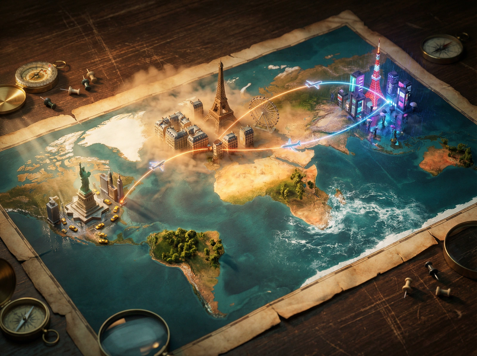 A weathered {antique parchment world} map spread across {a scarred wooden explorer’s table}, bursting with photorealistic miniature worlds erupting from marked locations. {Paris} explodes from {Europe} as a living diorama—{the Eiffel Tower} towers above {winding Haussmann streets}, surrounded by {golden sunset mist} and {slowly rotating ferris wheels}. {Tokyo} rises from {Asia} with {Tokyo Tower} emerging through {neon-lit rainstorms}, tiny {salarymen crossing busy intersections} frozen mid-motion. {New York City} materializes from {North America} where {the Statue of Liberty} pierces through {dramatic god rays}, {yellow taxi cabs and street vendors} spilling across miniature streets. Connecting routes glow as {pulsing lines of light}—miniature {airplanes} suspended impossibly between worlds. The map's surface transitions from flat parchment to living terrain: oceans become actual churning water with {foamy crashing waves}, deserts shimmer with real heat haze, forests sprout miniature trees. Each city exists in its own time: {warm golden hour light} bathes one, {cool blue twilight} illuminates another, {electric night glow} glows over the third. {tiny compasses, magnifying glasses, and scattered push pins} scatter around the map edges. {cinematic macro photography}, {rich teal-and-amber tones}, extreme depth of field, 8K, {retro-futuristic} meets magical realism.