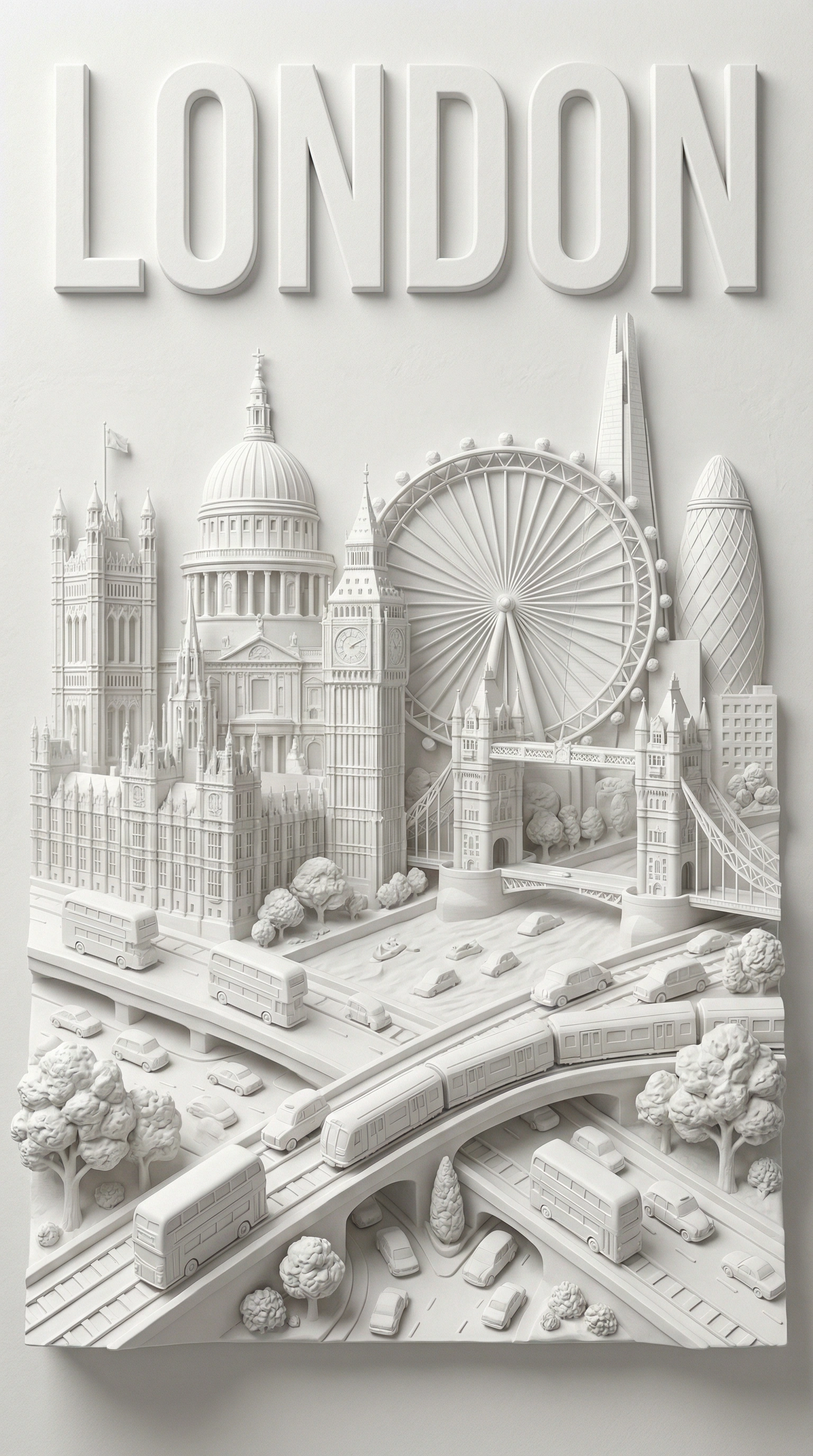 A highly detailed 3D bas-relief poster design representing [London]. A dense collage composition featuring the most iconic landmarks and skyline of [London]. Foreground filled with local transportation systems, busy highway networks with miniature cars, and native vegetation. At the top, features prominent, large, embossed English text in capital letters spelling out the name of the location. Pure white monochromatic clay render, embossed paper texture, soft studio lighting, high visual density, clean commercial illustration style.