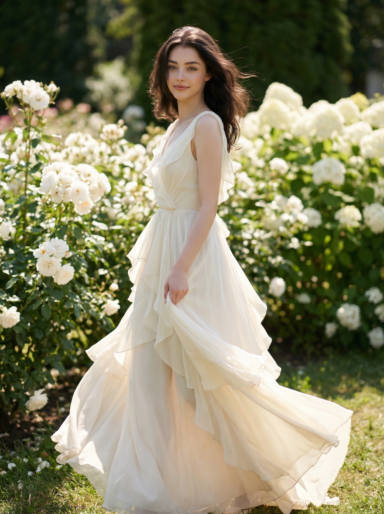 { "render_goal": "Luxury daytime garden portrait", "subject": { "pose": "female walking slowly", "expression": "effortless grace", "skin_tone": "fair porcelain" }, "wardrobe": "ivory chiffon gown with layered softness", "environment": { "location": "bright white flower garden", "props": "soft shadows, natural sunlight" } }