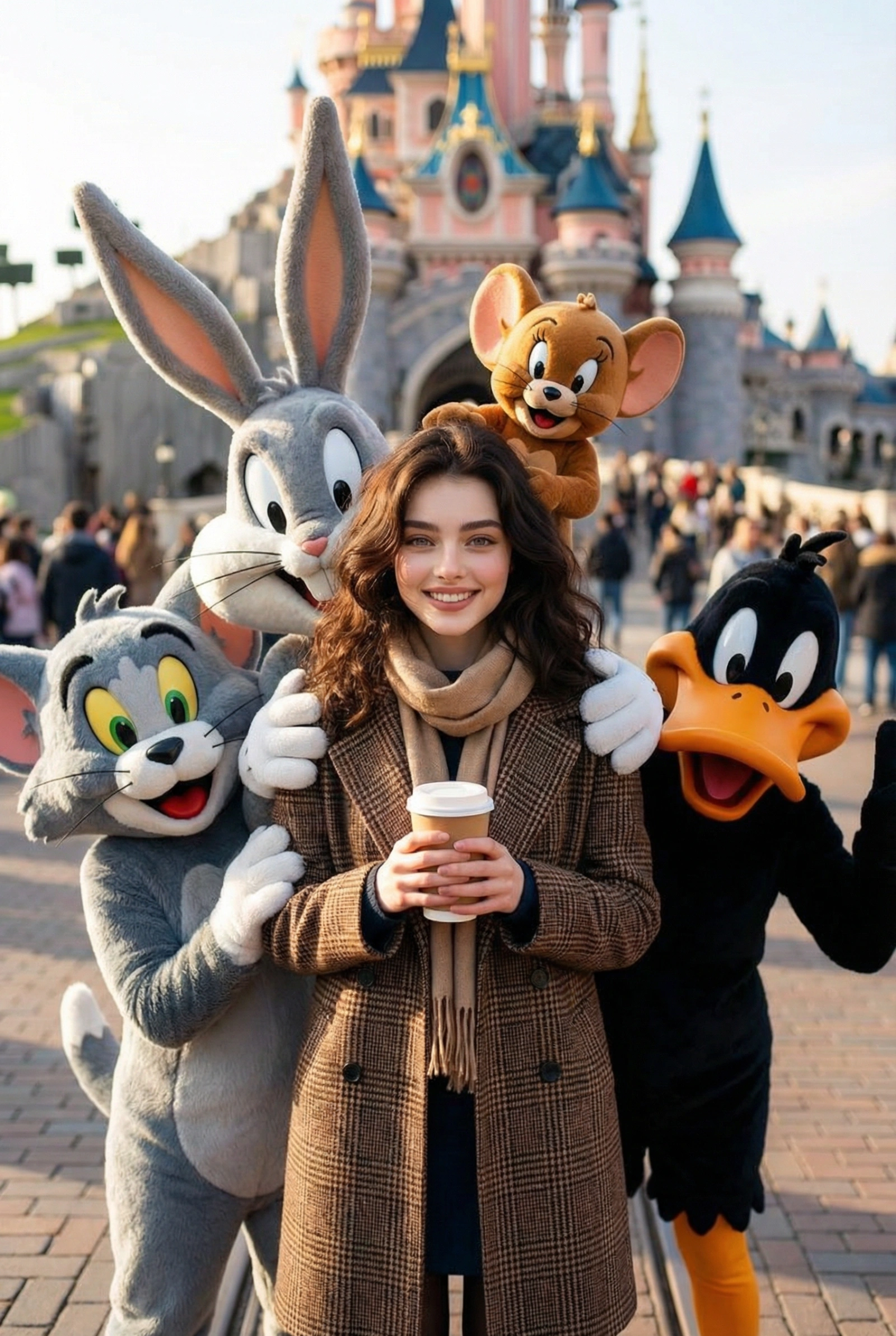 { "Objective": "Create a cheerful lifestyle portrait set in a magical theme park with joyful mascot characters", "PersonaDetails": { "PrimarySubject": { "Type": "Young woman", "Pose": "Standing relaxed, holding a takeaway coffee cup with both hands", "Expression": "Warm smile, cheerful and relaxed", "Style": "Casual lifestyle look" }, "MascotCharacters": [ { "Type": "Tall grey rabbit mascot", "Interaction": "Hugging the woman from behind", "Emotion": "Joyful, playful" }, { "Type": "Grey cat mascot", "Position": "Standing at her side", "Emotion": "Friendly, happy" }, { "Type": "Black duck mascot", "Position": "Standing on the opposite side", "Emotion": "Playful and welcoming" }, { "Type": "Small brown mouse mascot", "Position": "Playfully posing above the group", "Emotion": "Energetic and mischievous" } ] }, "SceneDescription": { "Location": "Famous theme park", "Background": { "Landmark": "Fairytale castle", "Treatment": "Softly blurred for depth" }, "Environment": "Open plaza with a lively, family-friendly atmosphere" }, "Composition": { "Framing": "Medium lifestyle portrait", "Grouping": "Centered subject surrounded by characters", "DepthOfField": "Shallow depth of field", "Focus": "Sharp focus on faces with softly blurred background" }, "LightingAndColor": { "Lighting": "Bright natural daylight", "ColorPalette": "Vibrant, saturated yet balanced colors", "Highlights": "Soft, clean highlights enhancing cheerful mood" }, "ArtDirection": { "Style": "High realism blended with animated character charm", "Aesthetic": "Playful, magical, family-friendly", "DetailLevel": "Ultra-detailed textures on clothing and mascot costumes" }, "PhotographyStyle": { "Genre": "Theme park lifestyle photography", "CompositionStyle": "Cinematic yet candid", "ImageQuality": "High resolution, crisp detail" }, "Mood": { "Tone": "Happy, welcoming, whimsical", "Energy": "Lighthearted, joyful, magical" }, "NegativePrompt": [ "dark mood", "empty background", "scary characters", "low resolution", "blurry faces", "harsh shadows", "desaturated colors" ], "ResponseFormat": { "Type": "Single image", "Orientation": "Portrait", "AspectRatio": "2:3" } }
