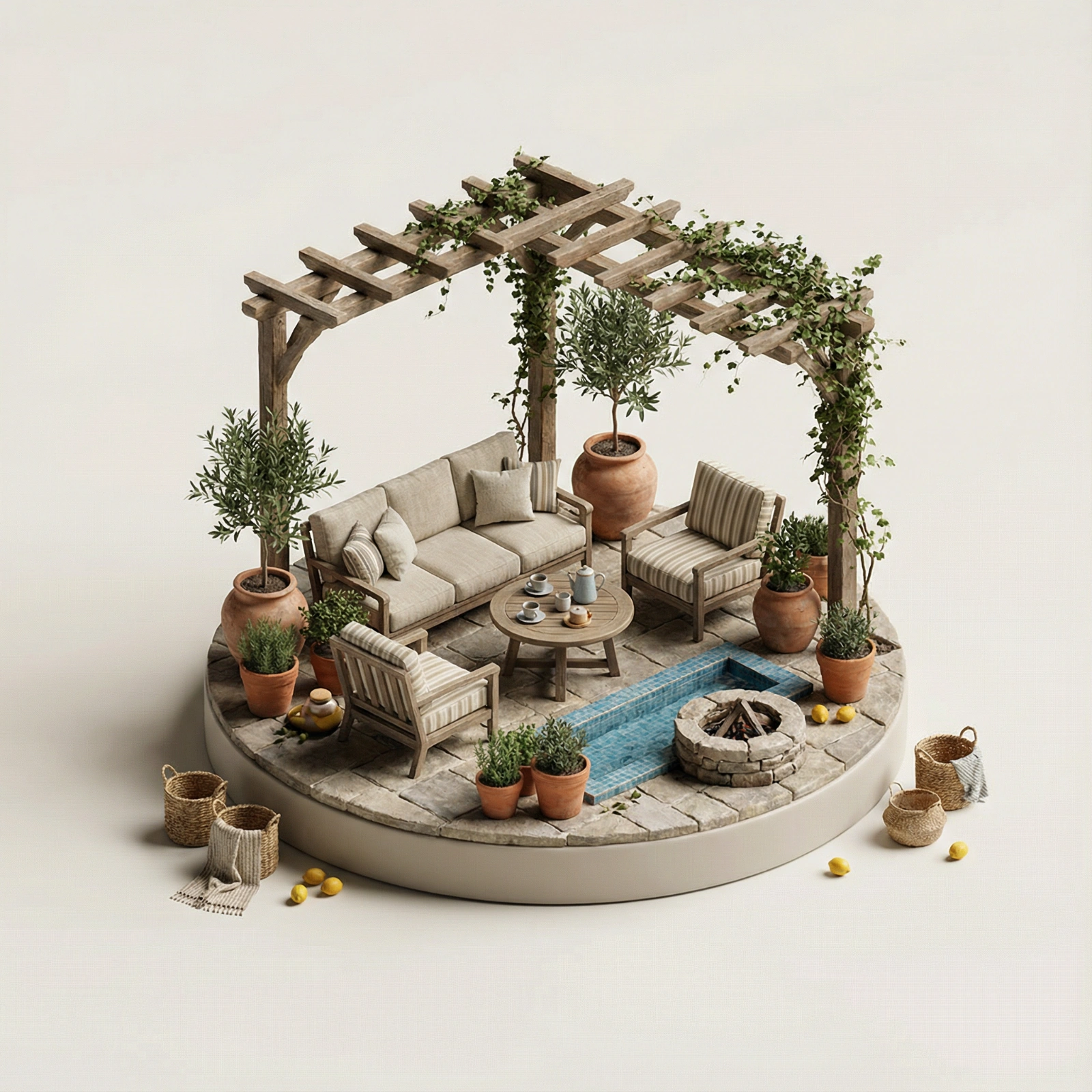 A miniature isometric lifestyle diorama of [Mediterranean backyard leisure patio], accurately depicting a familiar daily-life environment and its realistic layout, placed on a small floating base with thoughtfully arranged surrounding objects and environmental details inspired by [Southern Europe residential lifestyle]. Realistic materials and natural textures, physically accurate surfaces such as wood, stone, fabric, ceramic, metal, and water where appropriate. True-to-life color palette based on real-world materials, warm and muted tones with natural variation. Off-white studio background with soft, natural lighting, gentle shadows, and clean composition. High-detail, realistic yet refined 3D render, premium miniature diorama aesthetic, no people, no text.