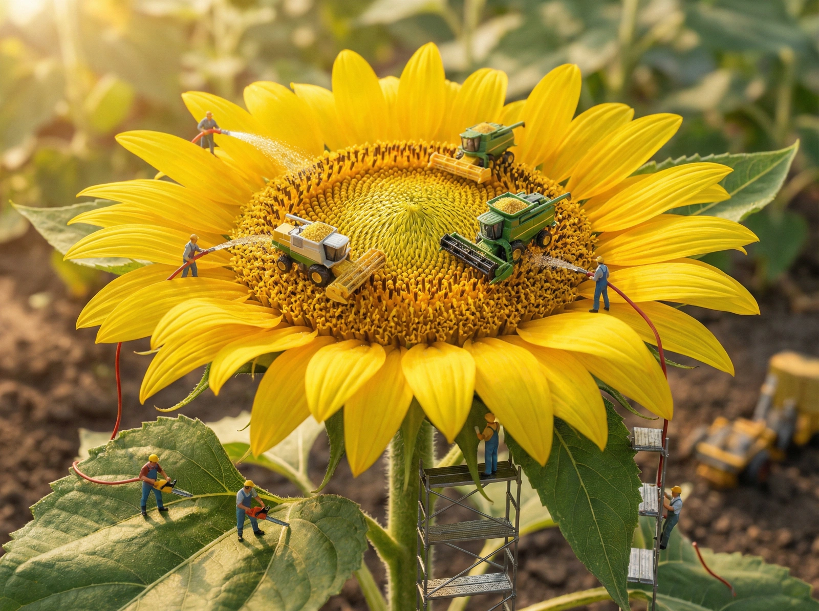 A wide-angle, tilt-shift macro photograph of a colossal blooming sunflower head serving as a busy agricultural operation site. Miniature farmers drive micro-combine harvesters across the central disc florets, collecting massive golden pollen granules. Teams use miniature fire hoses to water the vibrant yellow petals, while others use tiny chainsaws to trim giant green leaves at the base. Scaffolding is built around the stem. The setting is a sunny garden patch during golden hour. Highly detailed natural textures. --ar 4:3 --v 6.0