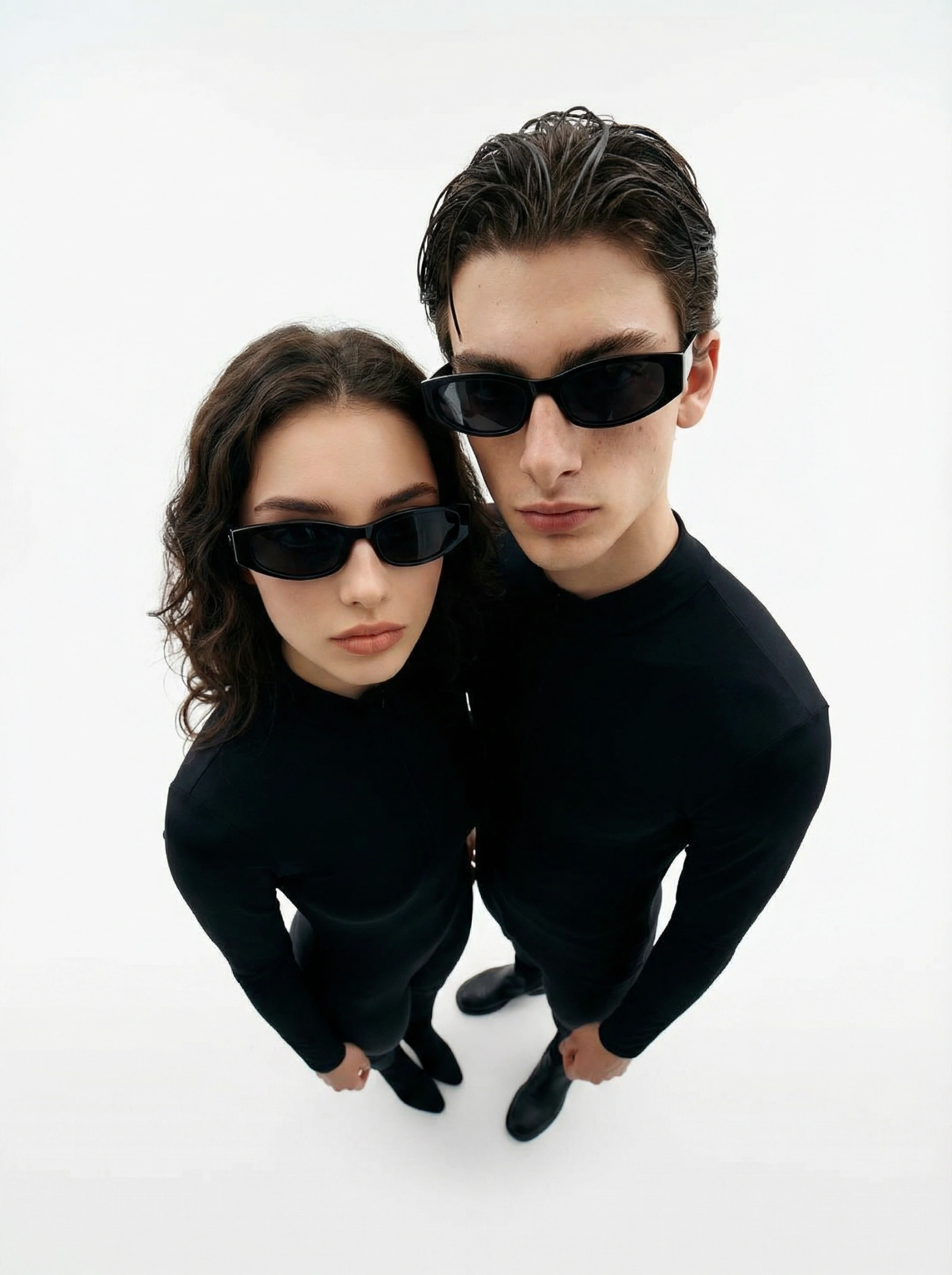 Minimalist fashion editorial photograph, overhead high-angle selfie perspective, two stylish young adults standing close together. Shot on a wide-angle lens with subtle perspective distortion, heads slightly enlarged, bodies tapering naturally. Both wearing sleek black outfits and narrow black sunglasses. Confident, neutral expressions. Pure white seamless studio background. Soft, diffused studio lighting with minimal shadows. High contrast, sharp focus. Contemporary eyewear campaign aesthetic. Ultra-clean composition, high-fashion realism, magazine editorial quality. 3:4 aspect ratio.