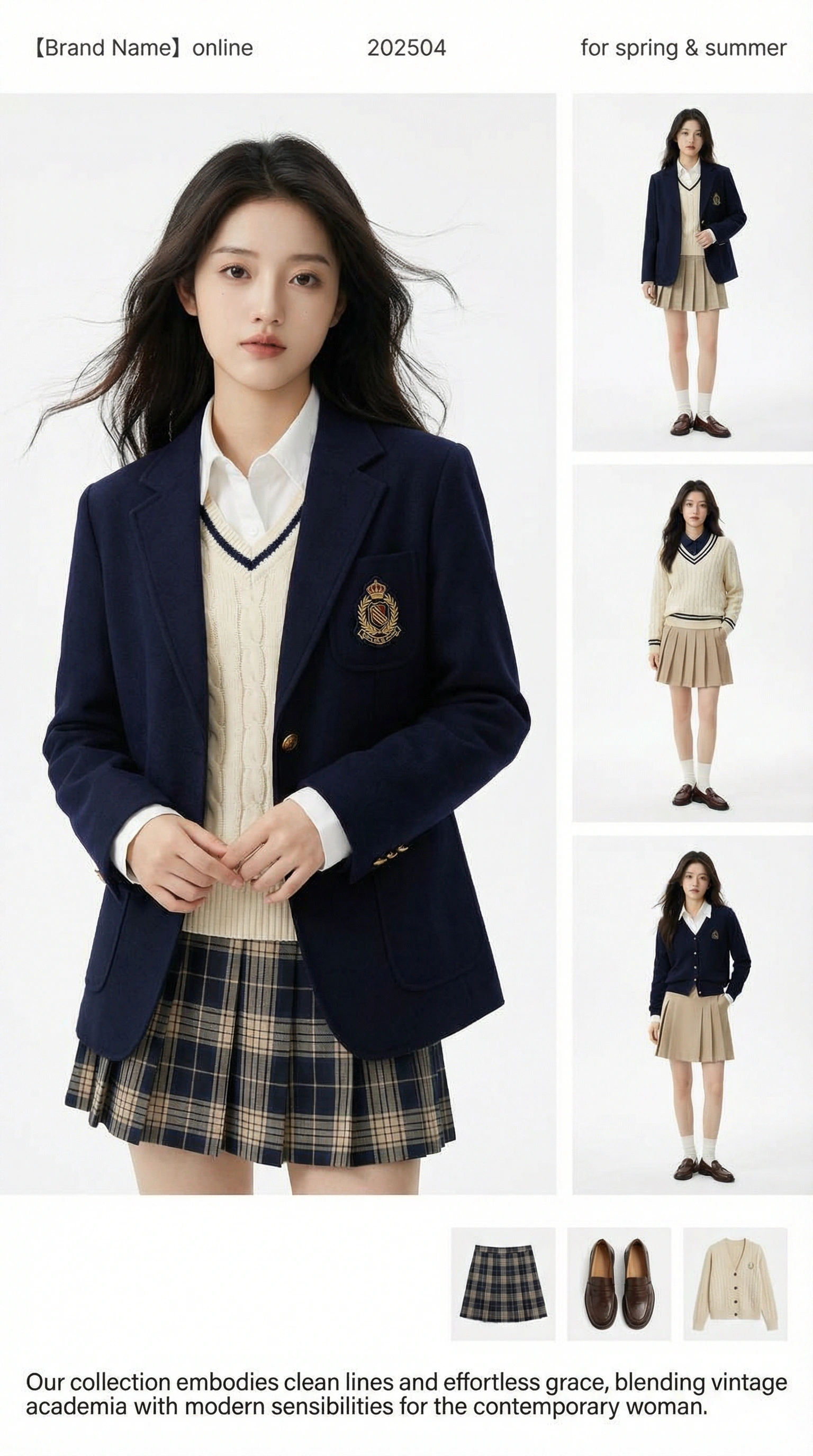A high-end independent women’s fashion brand lookbook poster. Overall pure white background, clean negative space, minimalist layout, presenting the visual style of a brand website / online lookbook. Left side of the frame: A female model as the primary visual focus, occupying most of the composition. Chinese female model, age 20–25, with a cool, restrained temperament. Medium-to-full body framing, natural standing posture with a slight body tilt. Expression is controlled and relaxed, calm gaze. Her aura sits between youth and maturity — clean, effortless, unpretentious. Hair falls naturally with a subtle sense of motion from a light breeze. Makeup is sheer, light, and natural. The model is wearing 【preppy-style outfit】. Fabric textures are clearly visible (knitwear, wool, mohair, etc.). The image feels realistic, delicate, and refined, with a commercial fashion photography quality. Right side of the frame: Two to three smaller full-body models arranged vertically in a neat layout. Each model showcases a different outfit from the same collection. Individual outfits have distinct styling, while maintaining a unified color palette and overall mood. Follows standard fashion lookbook display logic. Even spacing between figures, balanced proportions, generous negative space. Bottom-right area: A small selection of garment detail images (e.g. skirts, bottoms). Displayed flat or in a simple upright presentation. Presented in a catalog-style layout, not competing with the main visual. Typography & layout: Top-left small text: “【Brand Name】 online” Top-center text: “【Season Year, e.g. 202504】” Top-right text: “for spring & summer” A short paragraph of brand philosophy text in English at the bottom area. Typeface is modern sans-serif, light weight. Loose letter spacing, appearing as if printed into the image. Restrained, understated, not advertising-like, not exaggerated. Overall style: Independent designer womenswear aesthetic. Leaning toward niche Japanese & Korean brand sensibilities. Young, restrained, slightly vintage in feeling. Commercial lookbook photography style. Soft, even lighting with no harsh shadows. High-end, clean, and realistic imagery. No dramatic lighting effects, no exaggerated poses. Avoid: Advertising poster style. Bold slogans or large headline text. Dramatic or theatrical lighting. Neon colors or highly saturated tones. Exaggerated fashion posing. Runway or fashion show backgrounds. Complex or busy background elements. Illustration style, cartoon style, or 3D render style. Social-media cover aesthetics.