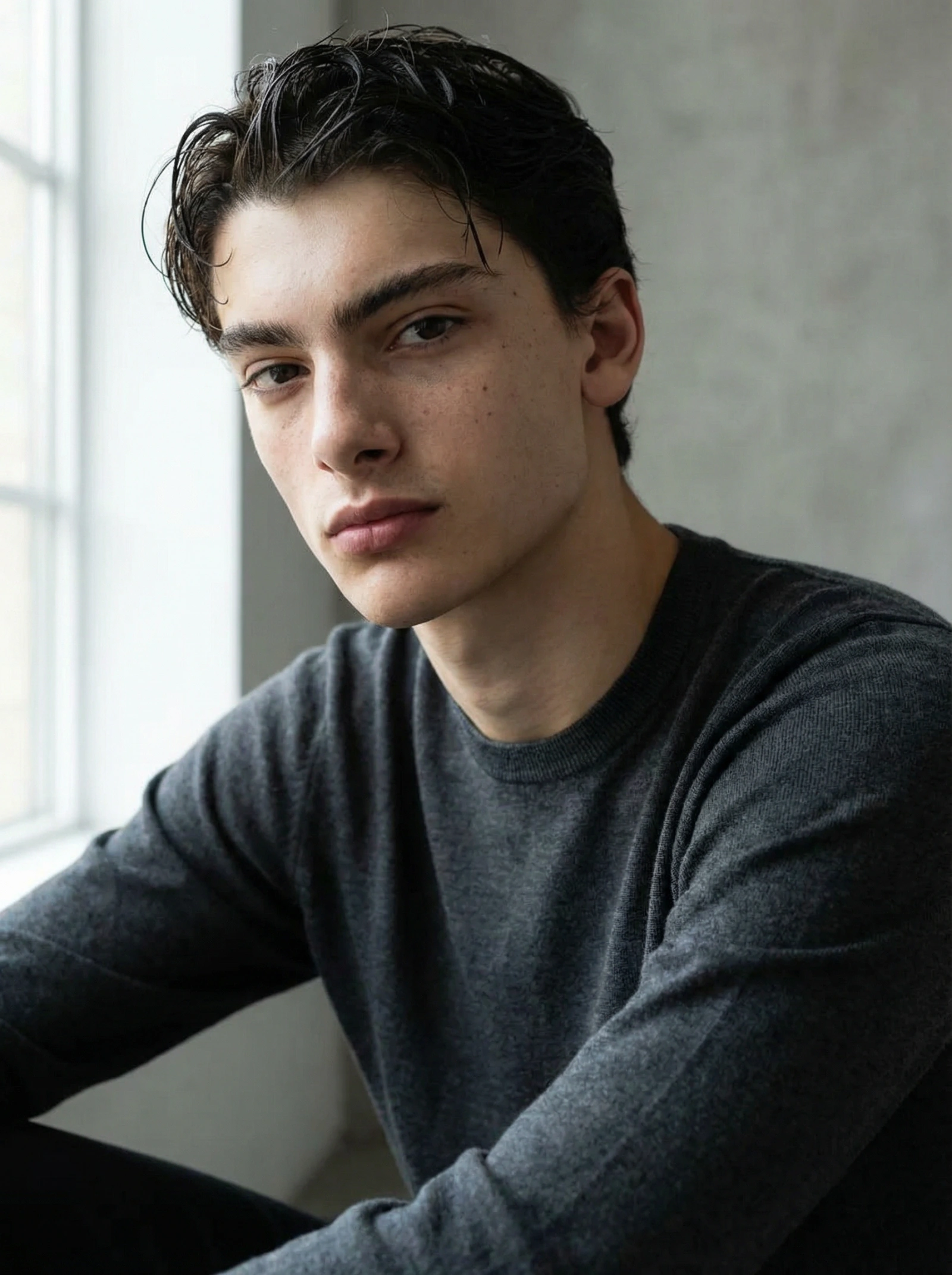 A high-resolution studio portrait of a young man, face perfectly preserved from the reference image, seated slightly angled toward the camera. He wears a clean monochrome outfit—soft knit top with refined tailoring—styled effortlessly. Lighting is soft and directional, coming from a large window source to one side, producing smooth gradients of light across his face and subtle shadow sculpting. Background is minimal and muted, emphasizing realism, texture, and quiet sophistication. Editorial fashion photography style, crisp detail, natural skin tones.
