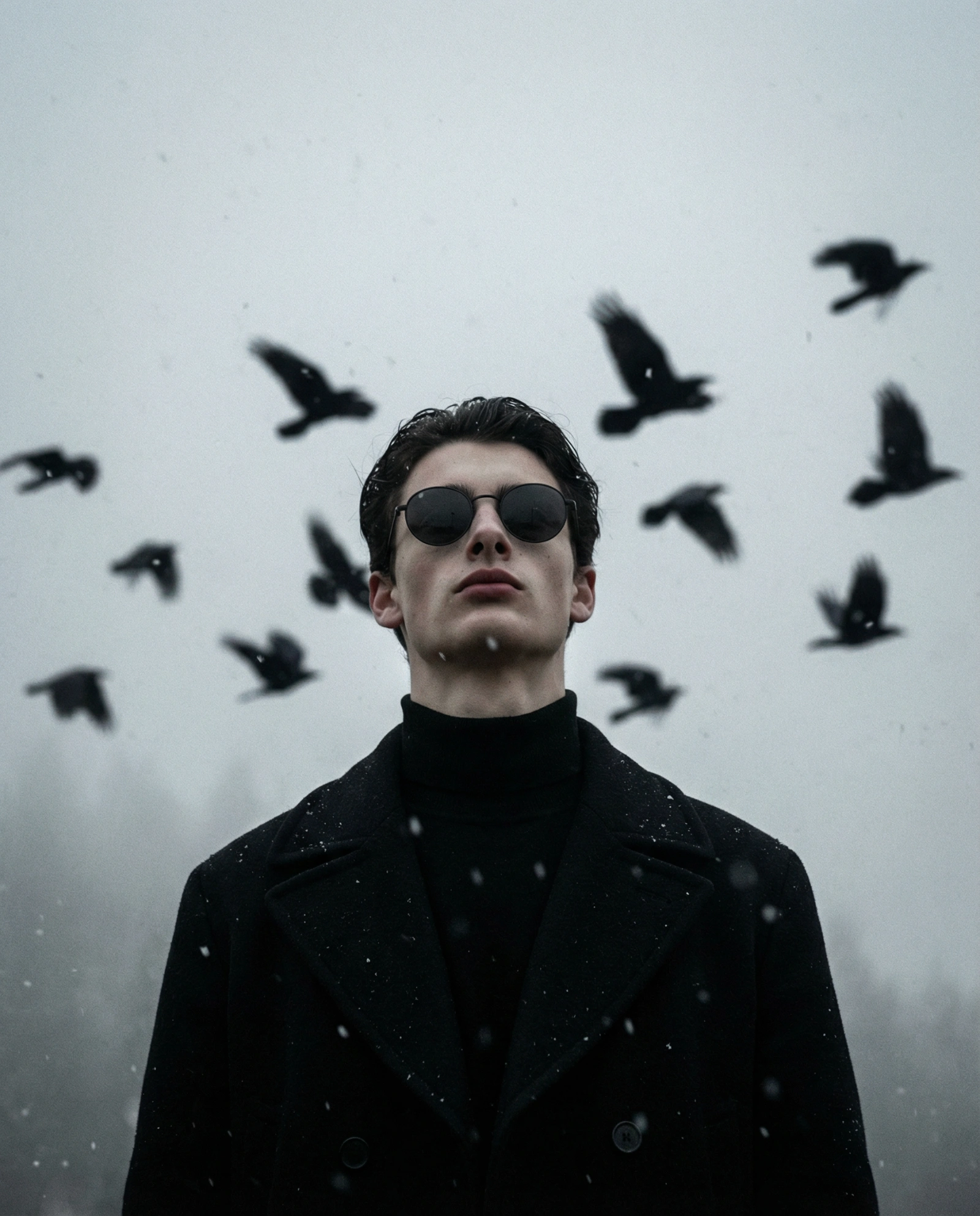 A cinematic low-angle portrait of a stoic man use image for face reference round dark sunglasses, wearing a heavy black wool overcoat and turtleneck. He is standing under an overcast, foggy grey sky. In the background, a flock of blurred black ravens are in mid-flight, creating a dynamic bokeh effect. Soft snowflakes are falling across the frame. Moody, dark aesthetic, desaturated color palette, high contrast, shot on 35mm film, grainy texture, 8k resolution.
