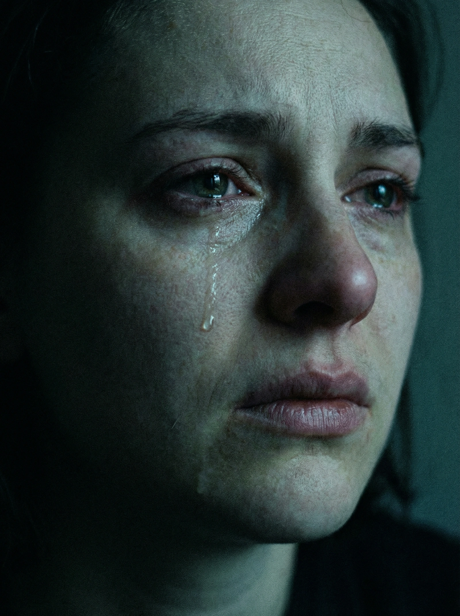 Generate a moody portrait of a person crying. A single tear is rolling down their cheek. The lighting is dark and cool, focusing strictly on the emotion in the eyes.