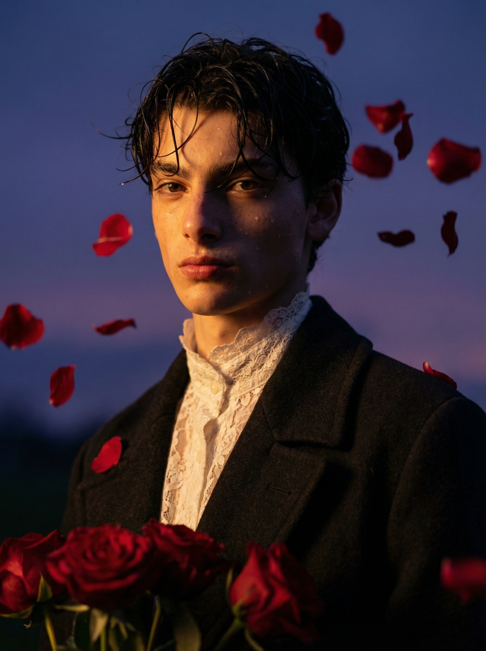 Cinematic fine-art portrait of a androgynous figure with dark, messy hair, wearing vintage lace and a dark coat, standing outdoors at twilight. Warm, dramatic side-lighting. Deep twilight sky background. Rose petals are floating and falling around the subject, with deep red flowers in the foreground. Extreme shallow depth of field, high detail, moody atmosphere.