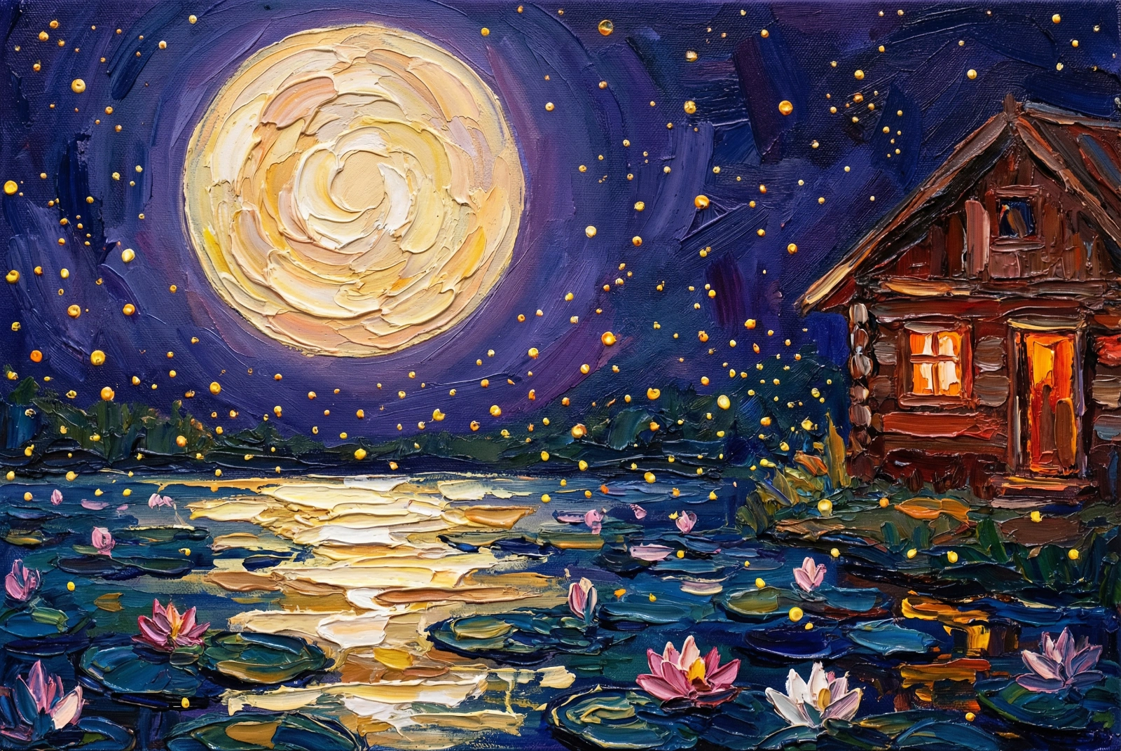 Impasto oil painting, palette knife texture. A tranquil summer night. A massive, swirling full moon composed of thick warm yellow and cream strokes dominates the upper left sky. Below, a peaceful pond filled with lily pads and lotus flowers. The water reflects the moonlight with heavy, textured paint drags. In the air, tiny glowing dots of yellow fireflies dance, mimicking the texture of stars. On the right, a cozy wooden cottage with warm orange light spilling from the windows. Deep indigo and purple sky contrasting with the warm moon. Dreamy and romantic atmosphere.