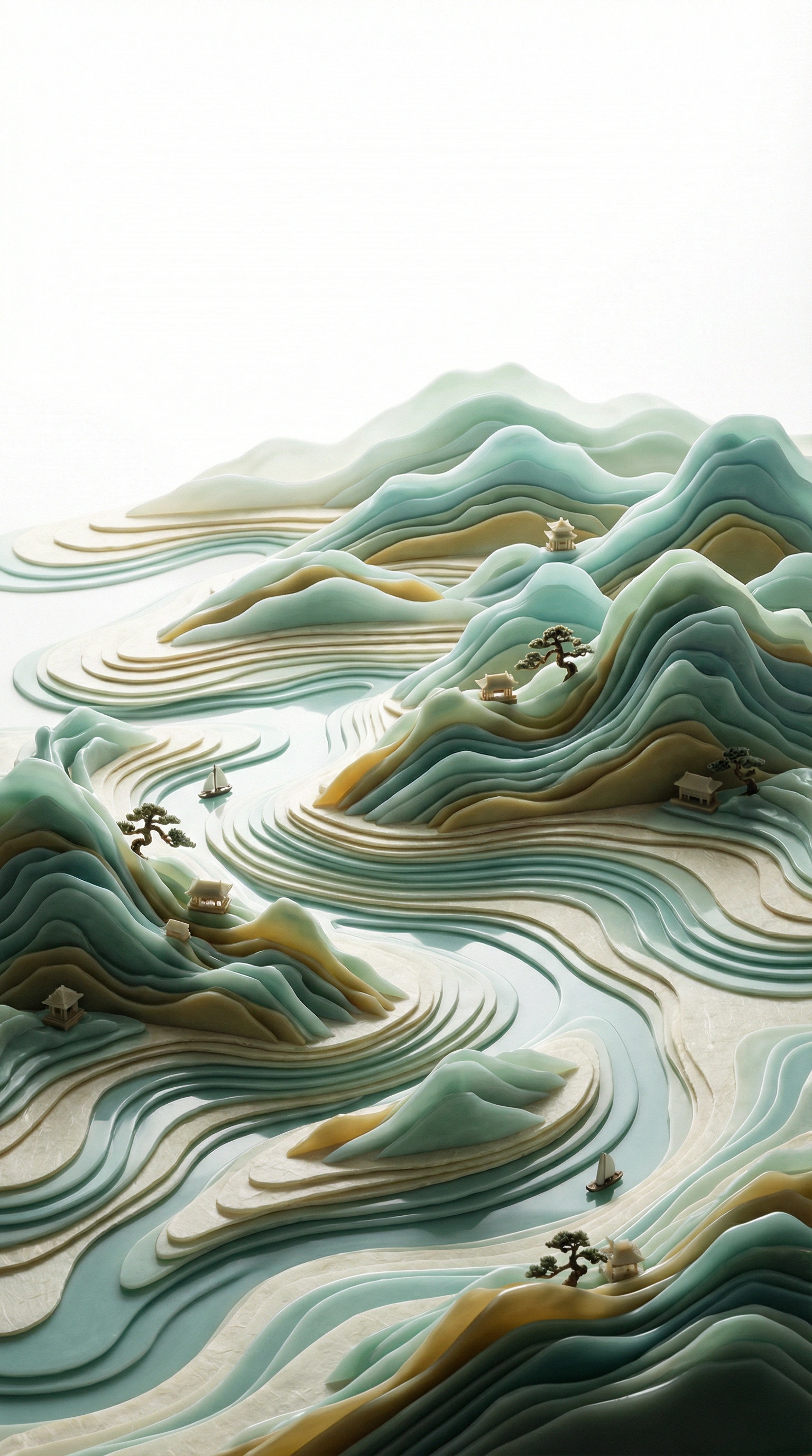 A vertical composition 3D topographic layered sculpture of a grand Chinese landscape. The style is Neo-Chinese minimalism. Countless flowing, organic layers of semi-translucent jade-like porcelain and textured paper stack to form rolling mountains and rivers. Deep ambient occlusion creates soft, profound shadows between the layers, giving incredible depth and tactile quality. The colors are inspired by traditional Chinese mineral painting: muted cyan, mineral green, ochre, and cream. Extremely tiny miniature traditional Chinese architecture, minuscule pine trees, and microscopic boats are nestled in the layers, emphasizing the vast scale. The edges of the landscape fade softly into a pure white background with ample negative space (liu bai) at the top. Studio lighting, ultra-detailed, intricate textures. --ar 9:16