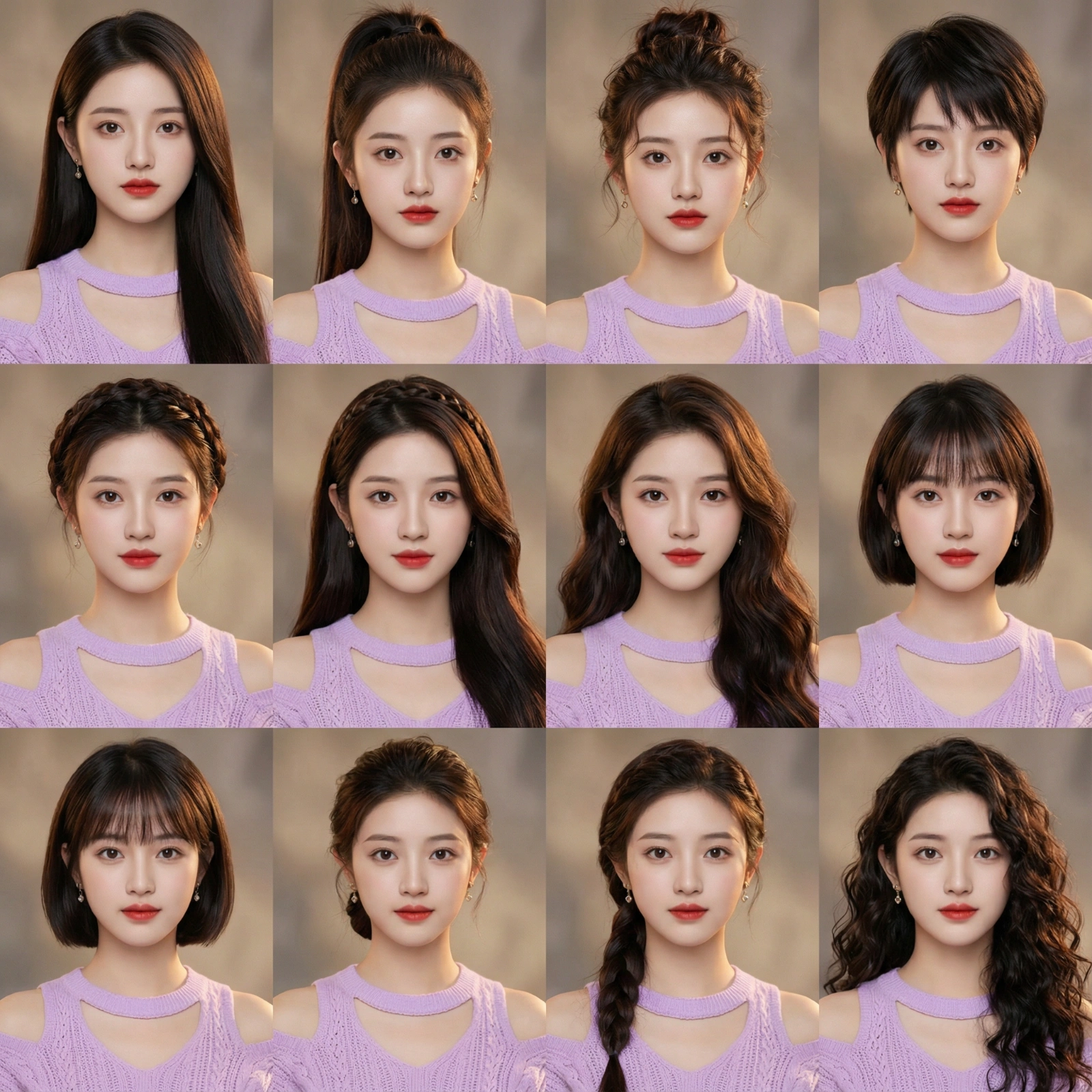 { "scene_type": "editorial beauty collage", "subject": { "identity_lock": true, "face_consistency": "perfectly matched across all frames", "expression": "unchanged, neutral and relaxed", "skin": "realistic texture, natural pores, high fidelity" }, "layout": { "grid": "4x3", "framing": "equal-sized portrait panels", "consistency": "symmetrical facial alignment in every frame" }, "hairstyle_variations": [ "sleek long straight hair", "high ponytail", "textured messy bun", "pixie haircut", "braided crown", "soft flowing waves", "short bob with bangs", "low tied bun", "side braid", "loose defined curls" ], "styling": { "outfit": "same neutral wardrobe across all panels", "makeup": "identical clean beauty makeup in every shot" }, "lighting": { "type": "soft studio lighting", "tone": "warm", "shadows": "gentle and natural" }, "background": { "style": "subtle blurred studio backdrop", "color": "warm neutral tones" }, "quality": { "detail": "ultra-detailed", "photography": "professional portrait", "finish": "high-end editorial look" } }