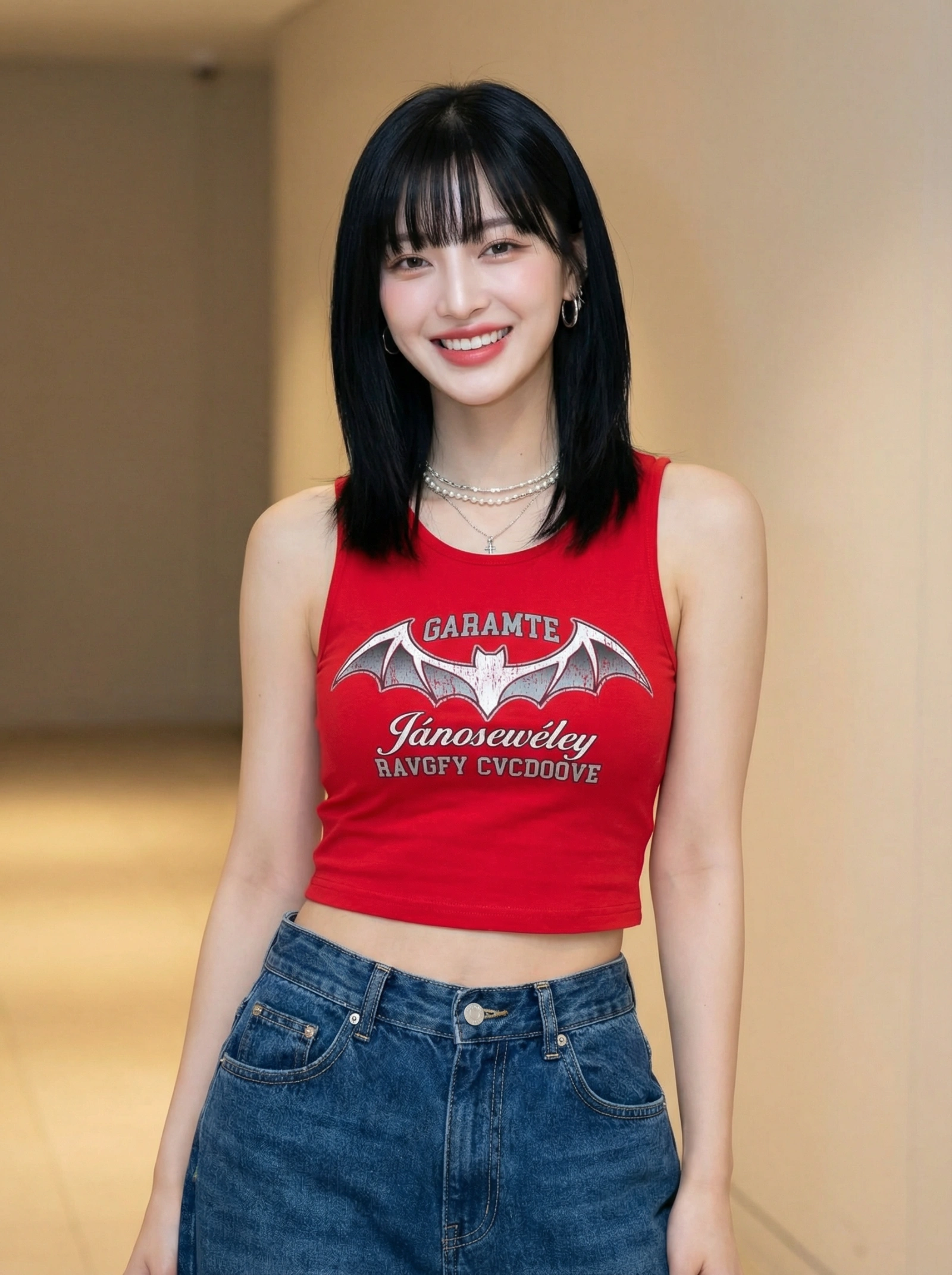 { "task": "Edit the photo without altering the face at all", "subject": { "gender_presentation": "woman", "pose": "standing", "expression": "neutral and confident" }, "style_and_clothing": { "top": { "type": "sleeveless crop top (tank top)", "color": "bright red", "graphics": { "print_colors": ["white", "gray", "silver"], "readable_text": [ "GARAMTE", "Jánosewéley", "RAVGFY CVCDOOVE" ], "graphic_shape": "wings or bat-like shape in the center" } }, "bottom": { "type": "denim jeans", "color": "dark blue", "fit": "high-waist", "cut": "loose / baggy", "visible_details": ["waistband", "pockets"] }, "footwear": { "visibility": "not visible" } }, "makeup_and_hair": { "makeup": { "skin": "smooth and natural", "lipstick": { "color": "bright red", "match_with_top": true }, "eyes": { "style": "minimal", "eyeliner": "thin" }, "eyebrows": "neatly shaped" }, "hair": { "length": "shoulder-length", "style": "straight bob", "color": "jet black", "bangs": "blunt front bangs covering the forehead" } }, "constraints": { "face_modification": "do not alter the face in any way", "identity_preservation": true } }